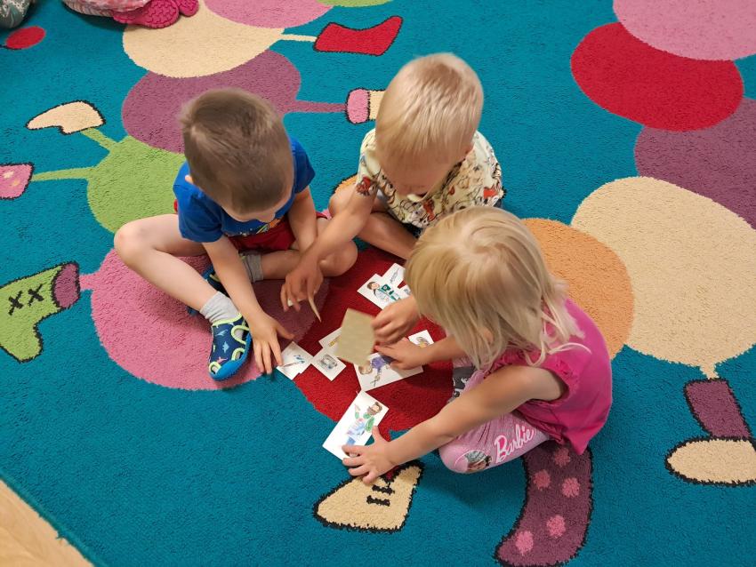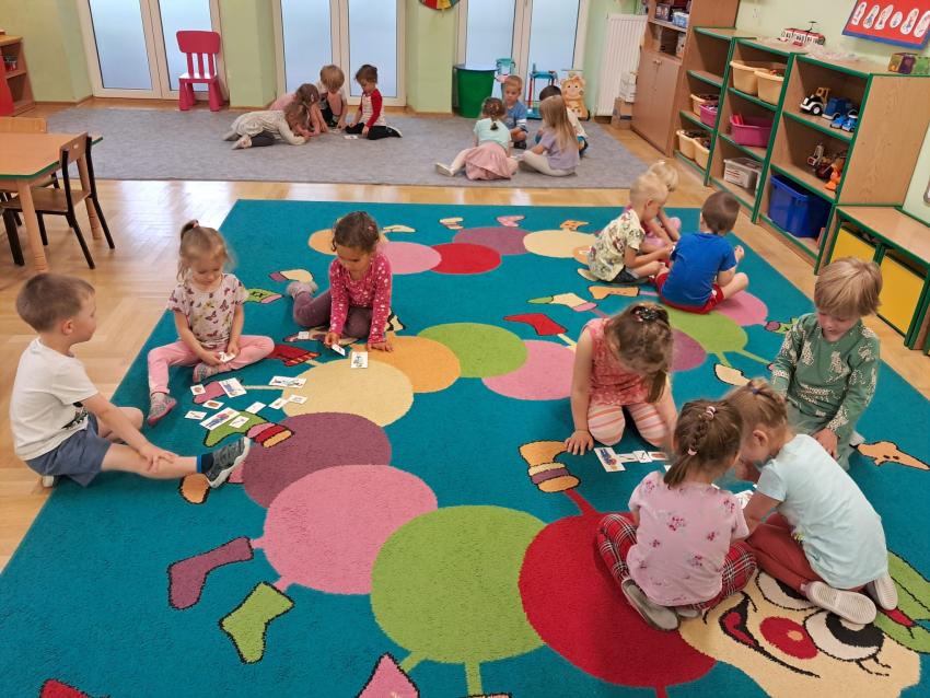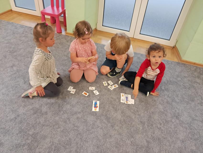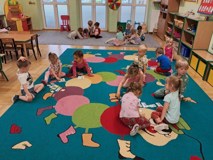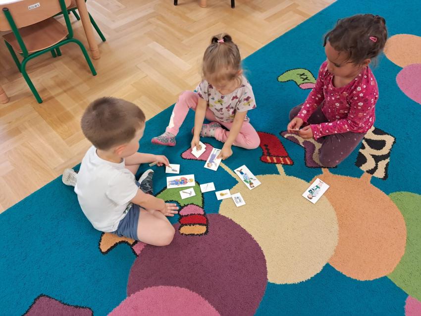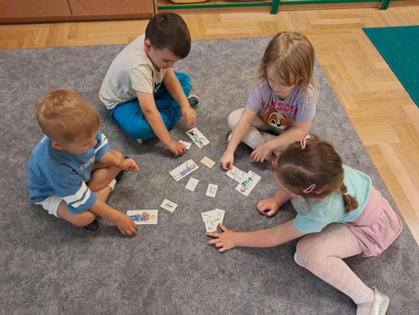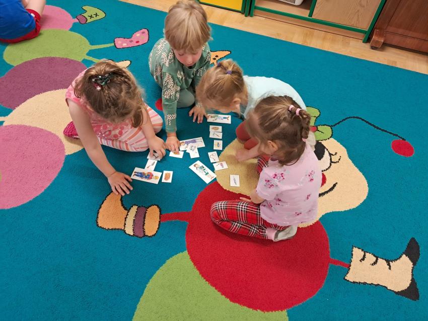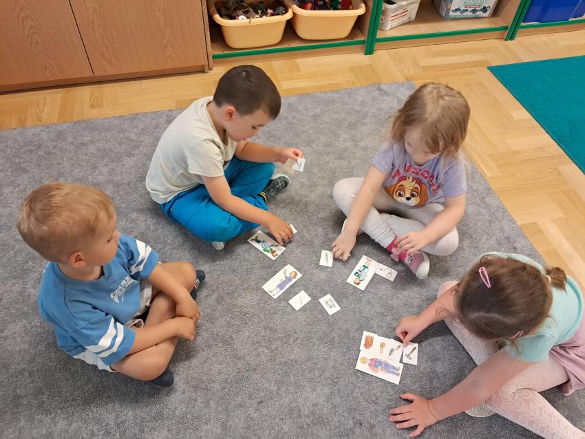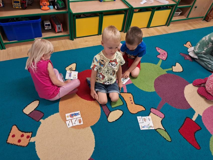 Praca grupowa do tematu Zawody. Zadaniem przedszkolaków było  dopasowanie przyborów do odpowiedniego zawodu.