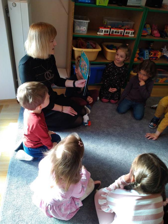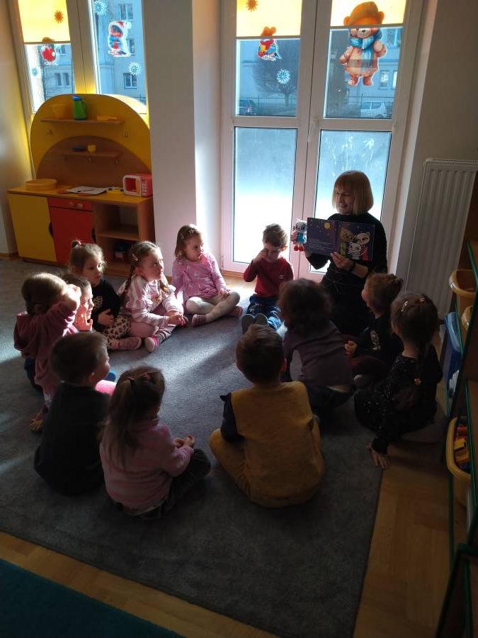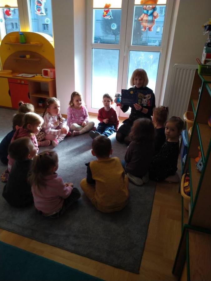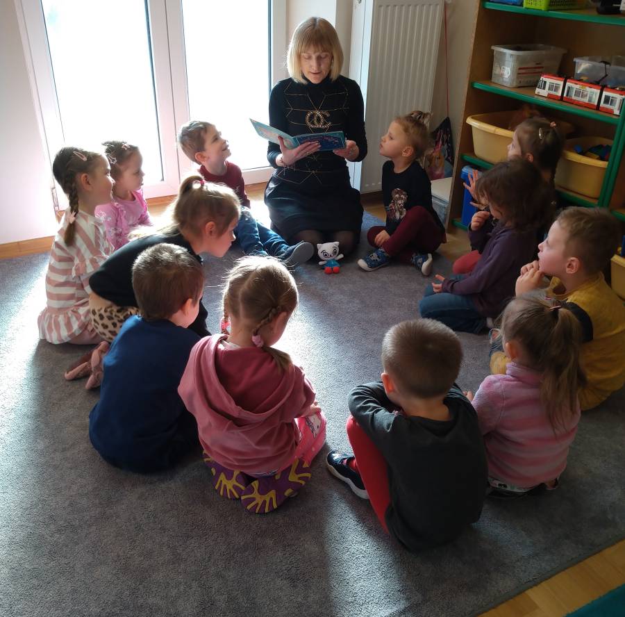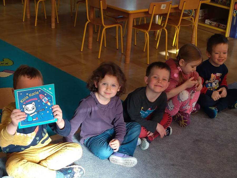 Żabki z wielką ciekawością wysłuchały bajki pt. Kicia Kocia w kosmosie, która jest realizowana w ramach innowacji pedagogicznej. Książki rozwijają u dzieci wyobraźnię i kreatywność, przenosząc ich w różne światy i pozwalając im na przeżywanie różnych przygód.