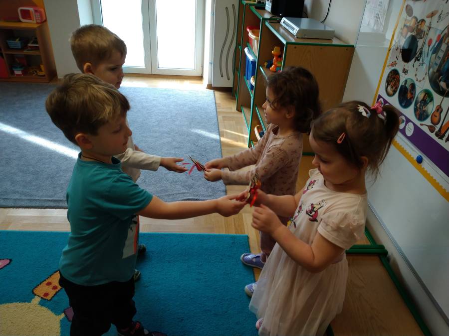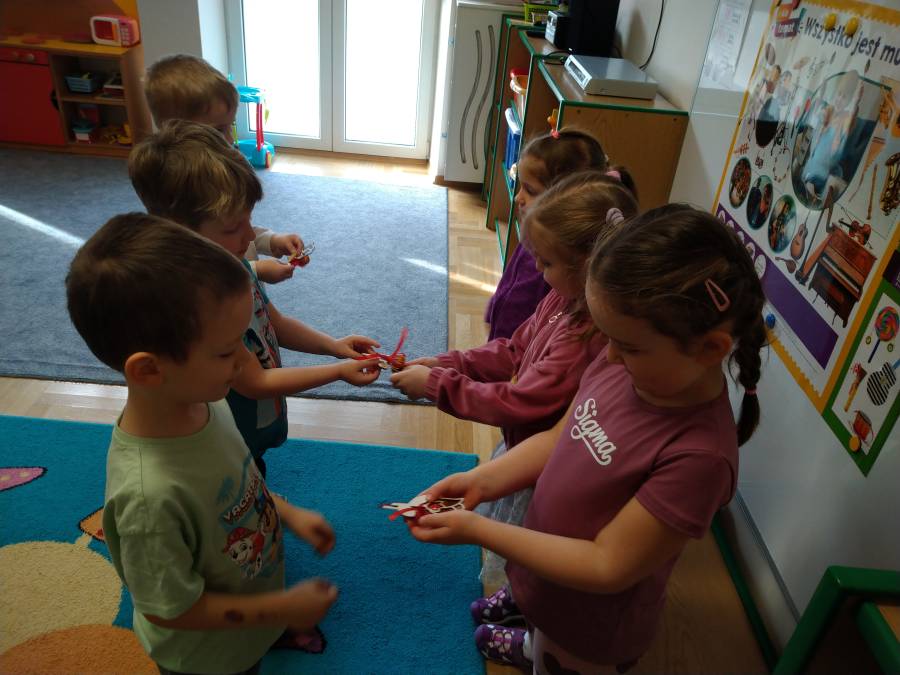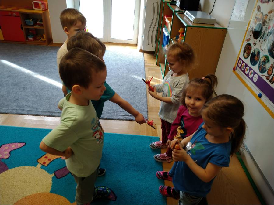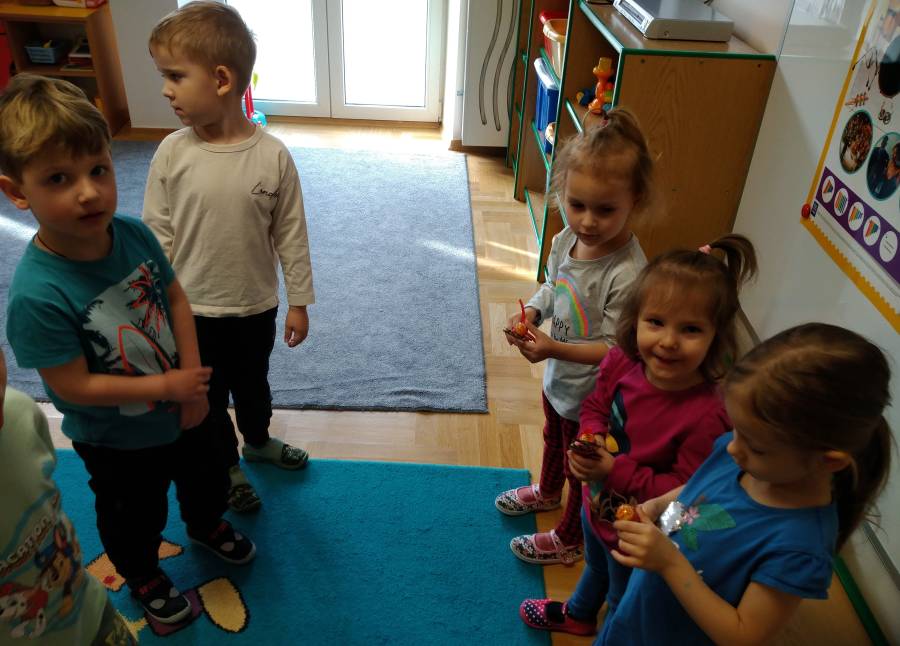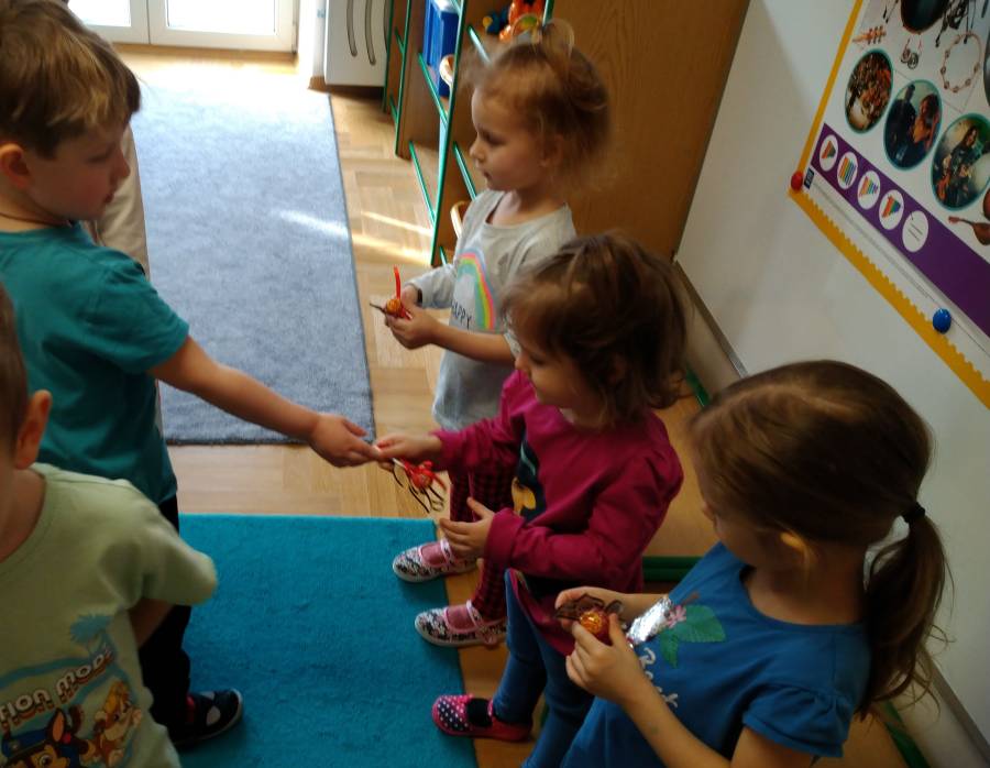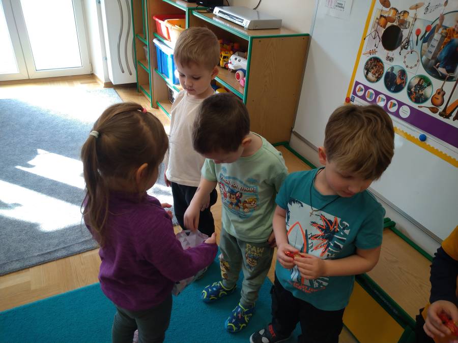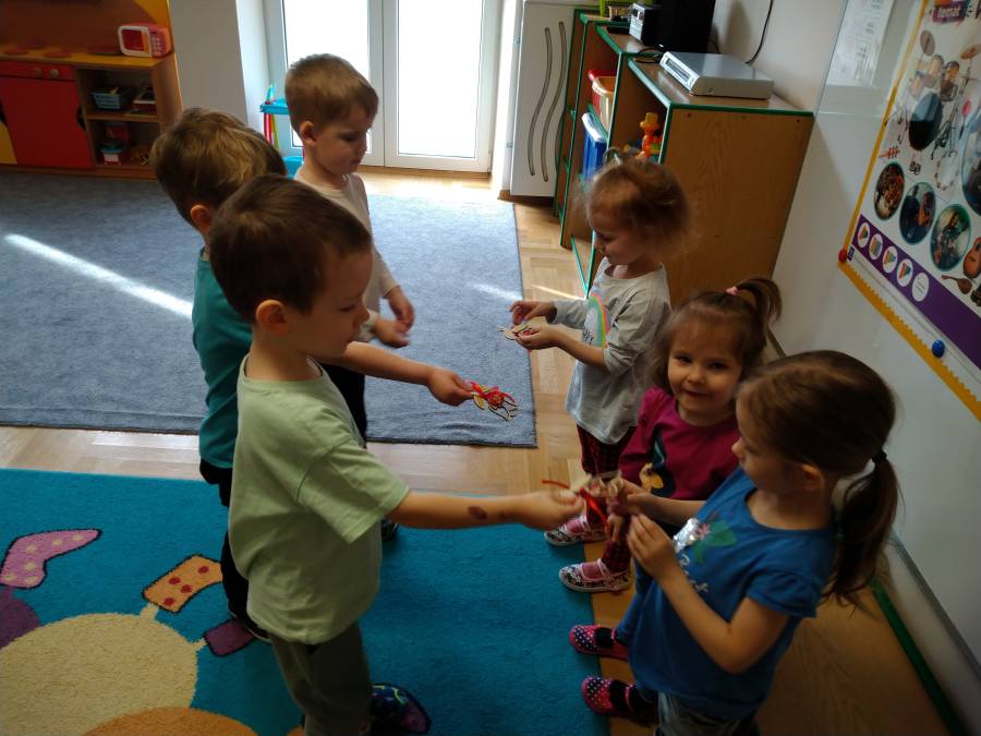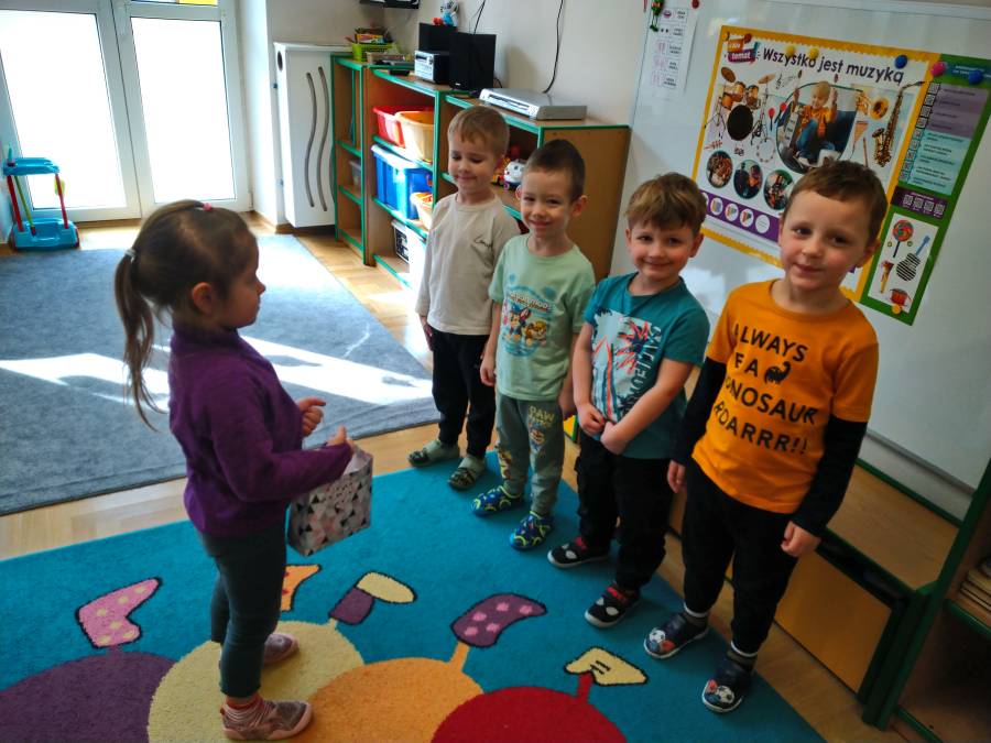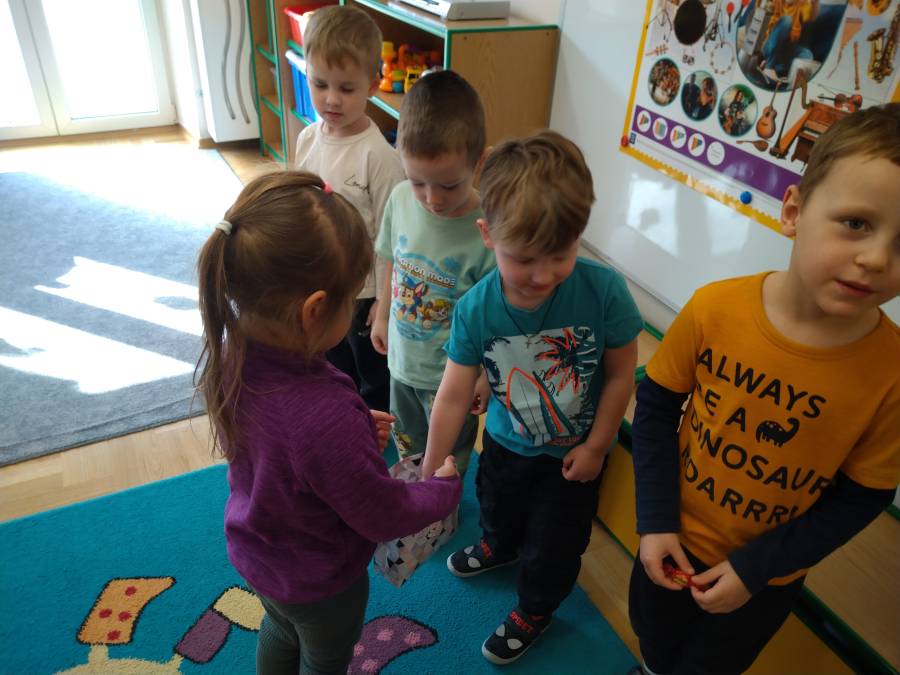 W grupie Żabek chłopcy nie zapomnieli o szczególnym dniu jakim jest Dzień Kobiet. W związku z tym złożyli dziewczynką życzenia i wręczyli słodki upominek. W zamian za ten sympatyczny gest zostali poczęstowani cukierkami.