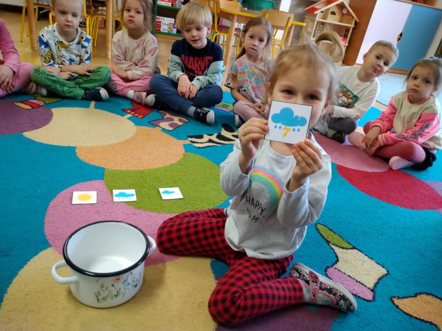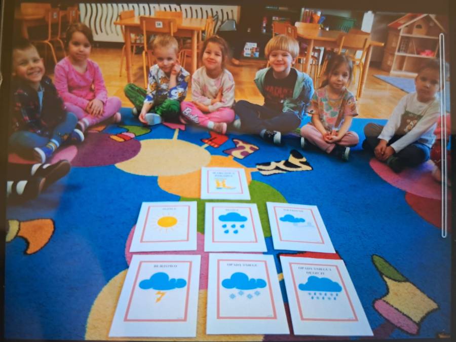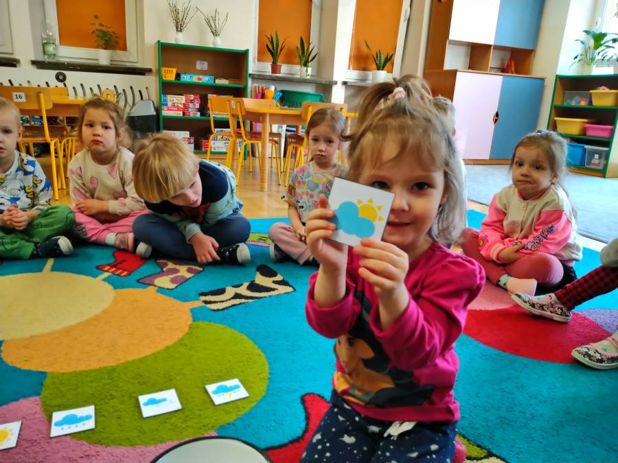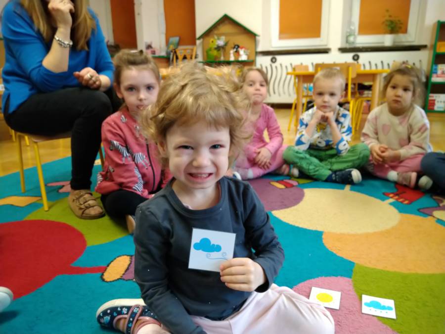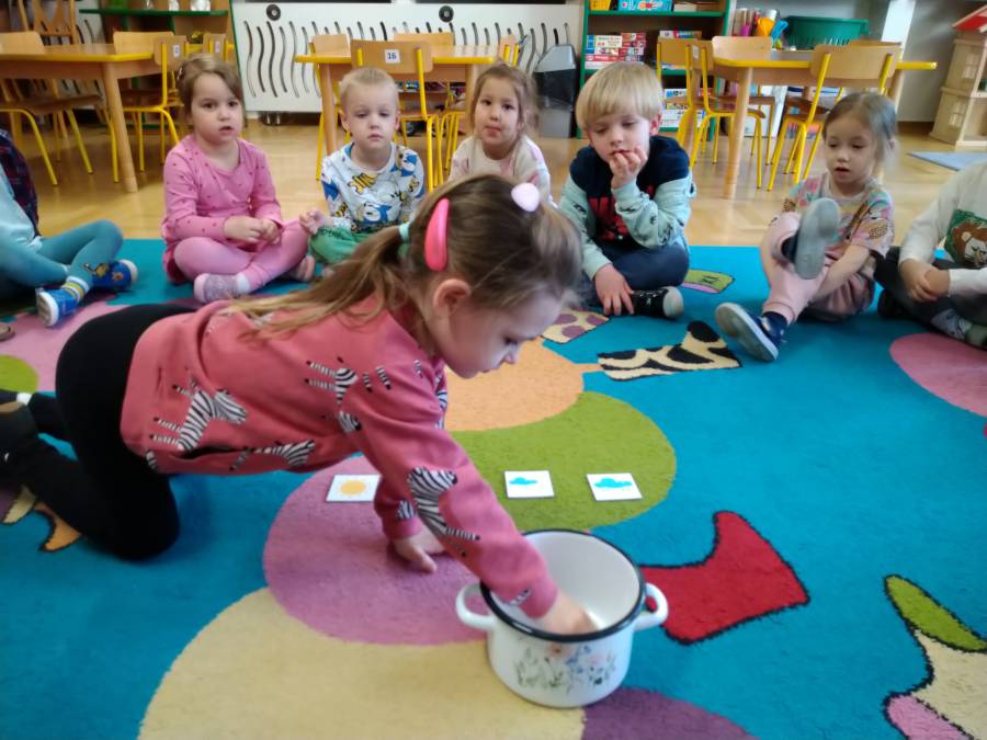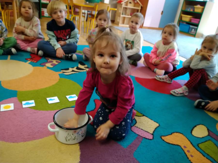 Tematem zajęć w grupie Żabek była marcowa pogoda. Dzieci poznały przysłowie ?W marcu jak w garncu? i dowiedziały się, co ono oznacza. Przedszkolaki przypomniały sobie nazwy występujących w okresie przedwiośnia zjawisk atmosferycznych tj. deszcz, wiatr, słońce, śnieg, chmury, utrwalały oznaczające je symbole graficzne, które wyciągały z garnka.