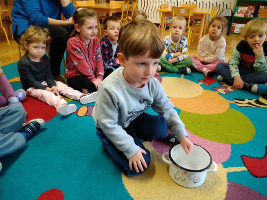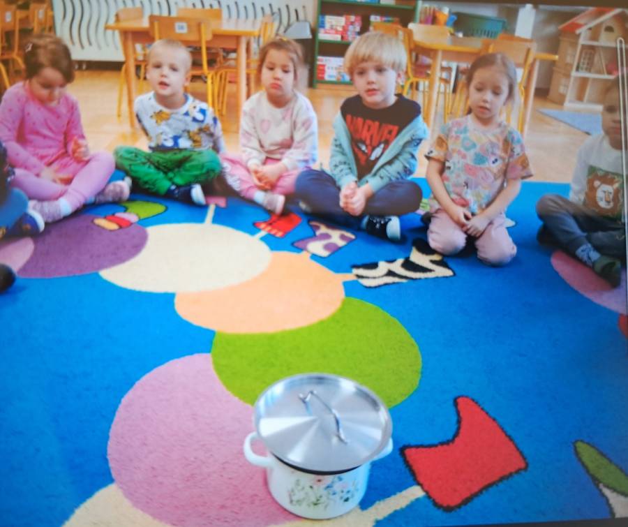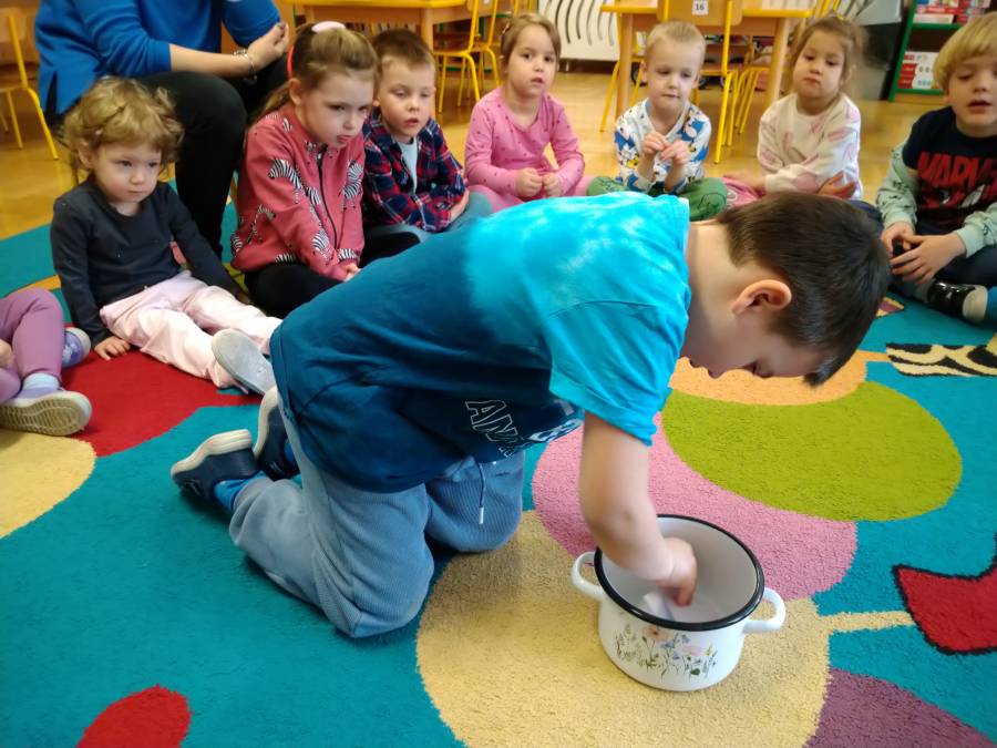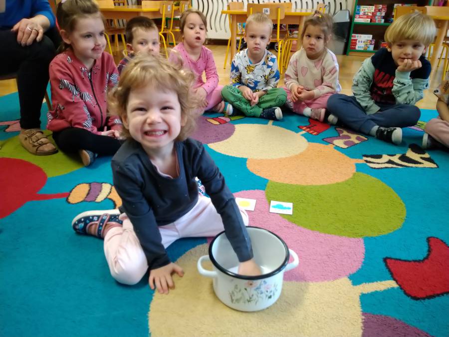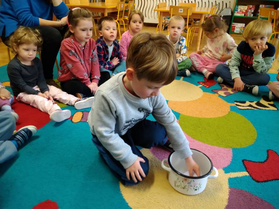 Tematem zajęć w grupie Żabek była marcowa pogoda. Dzieci poznały przysłowie ?W marcu jak w garncu? i dowiedziały się, co ono oznacza. Przedszkolaki przypomniały sobie nazwy występujących w okresie przedwiośnia zjawisk atmosferycznych tj. deszcz, wiatr, słońce, śnieg, chmury, utrwalały oznaczające je symbole graficzne, które wyciągały z garnka.