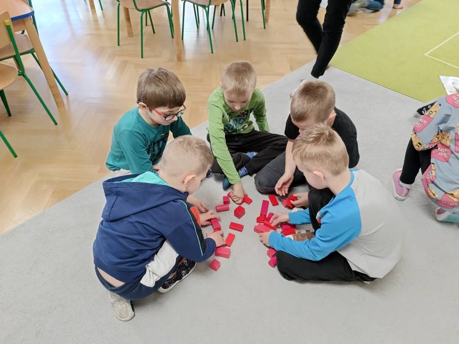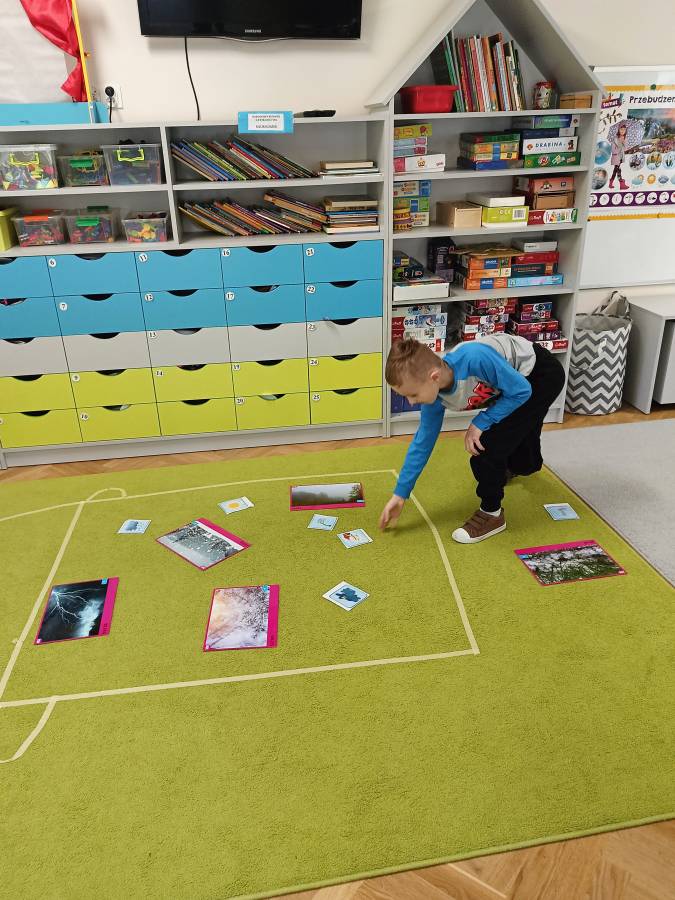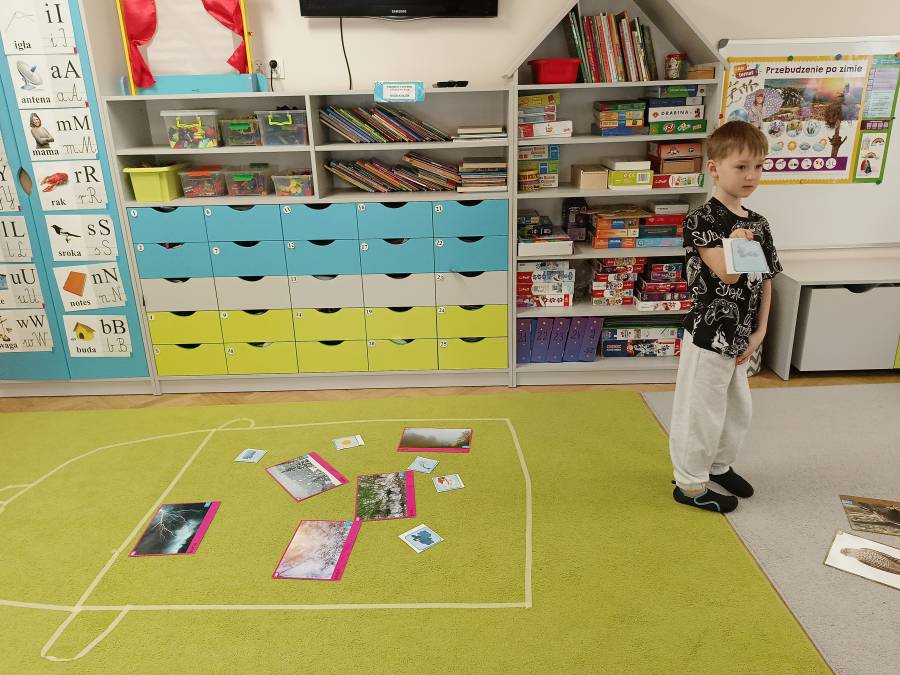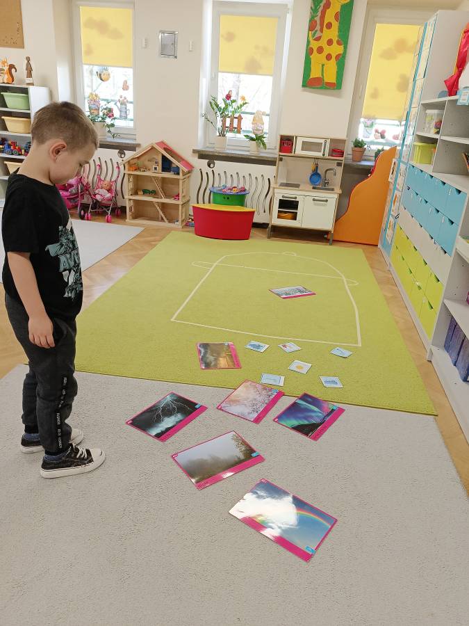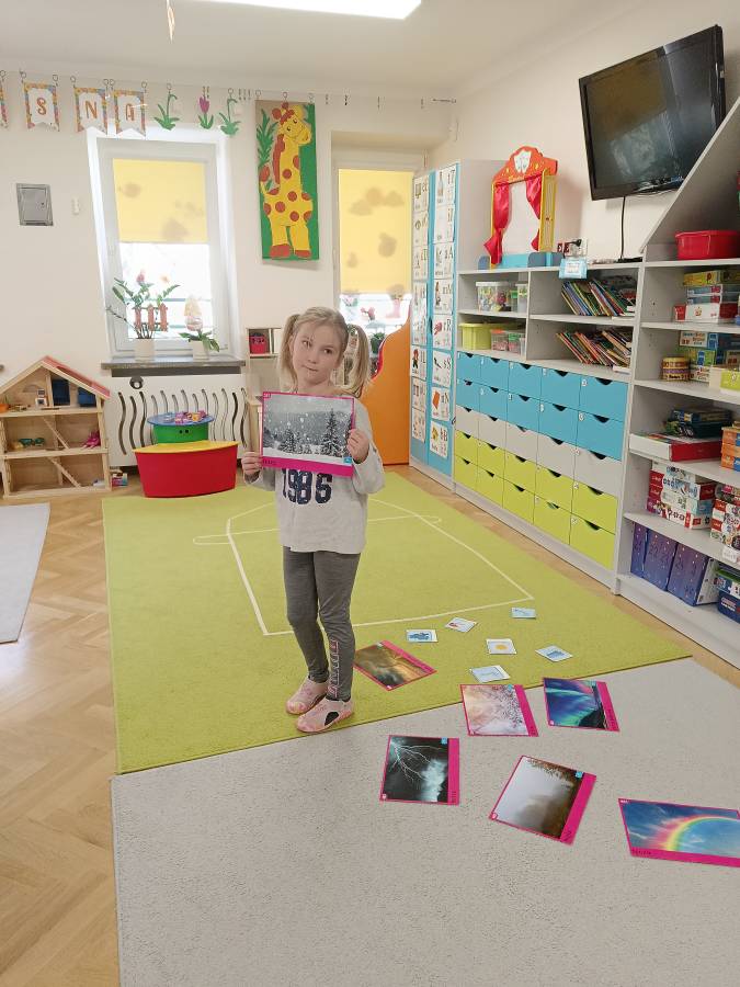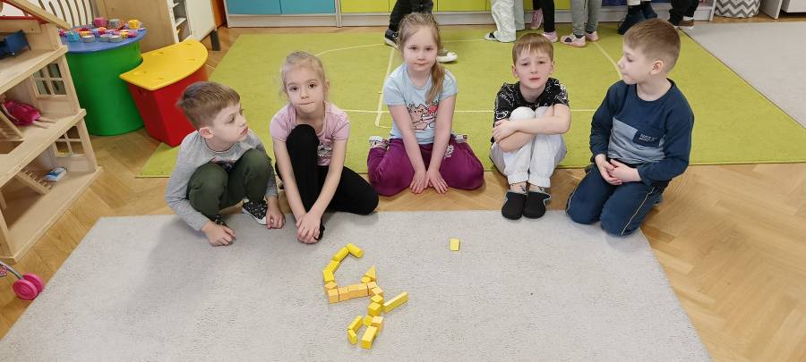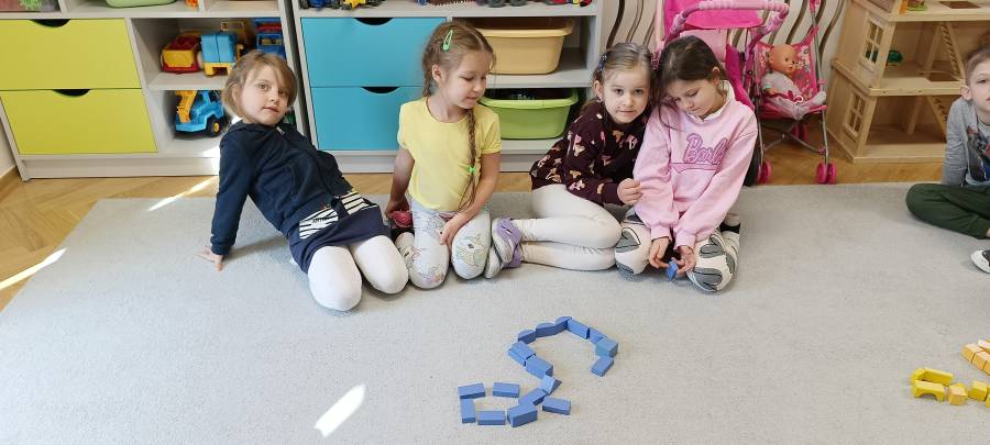 Dzieci podczas zajęć zapoznały się z kształtem litery G, g. Miały okazję rozwijać umiejętności współpracy tworząc w grupach literę mała i duża z klocków. Wzbogaciły również swoje słownictwo o przysłowie ,,W marcu jak w garncu" i dowiedziały się co to oznacza. Przypomniały sobie nazwy zjawisk atmosferycznych występujących w okresie przedwiośnia, poznawały oznaczające je symbole graficzne i wspólnymi siłami zrobiły ,, zupę marcową".