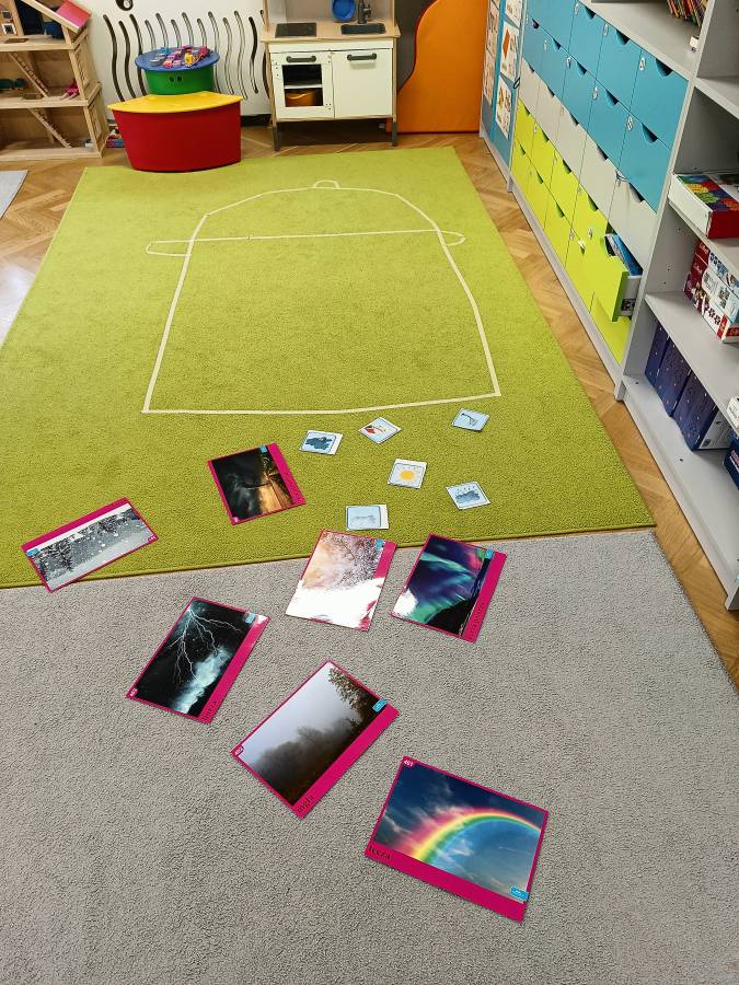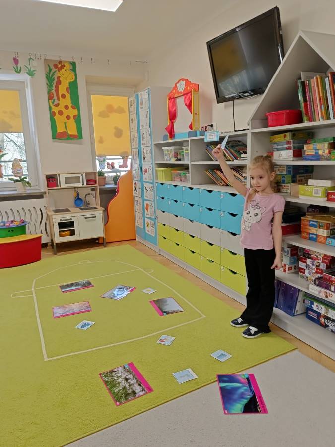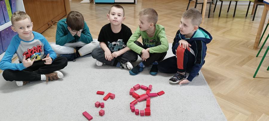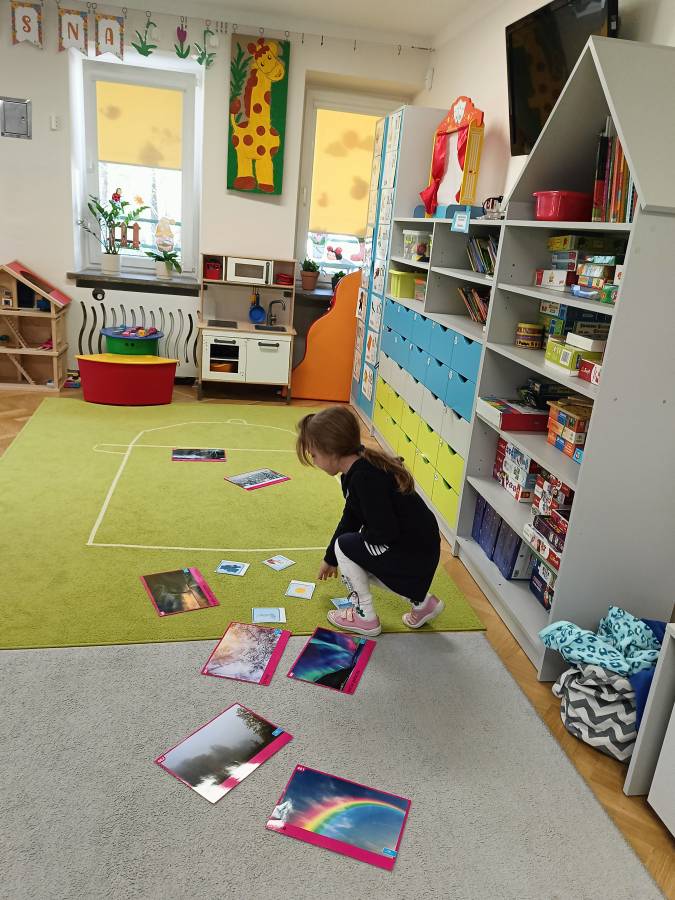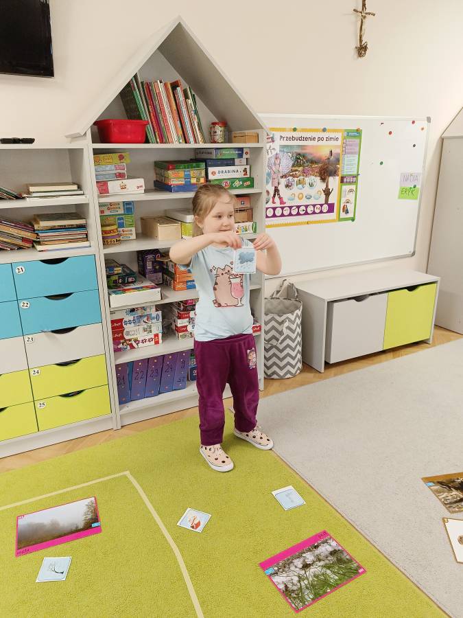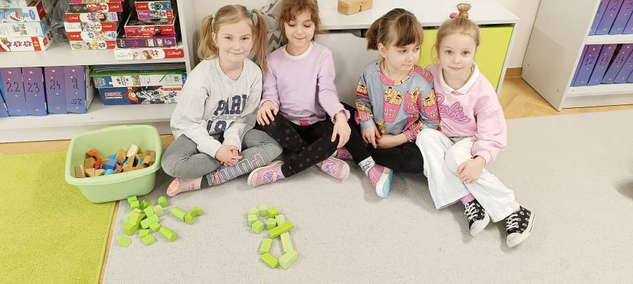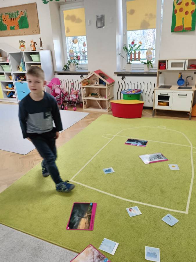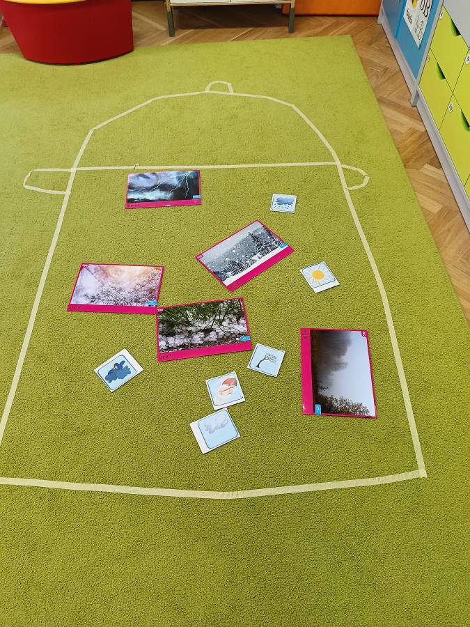 Dzieci podczas zajęć zapoznały się z kształtem litery G, g. Miały okazję rozwijać umiejętności współpracy tworząc w grupach literę mała i duża z klocków. Wzbogaciły również swoje słownictwo o przysłowie ,,W marcu jak w garncu" i dowiedziały się co to oznacza. Przypomniały sobie nazwy zjawisk atmosferycznych występujących w okresie przedwiośnia, poznawały oznaczające je symbole graficzne i wspólnymi siłami zrobiły ,, zupę marcową".