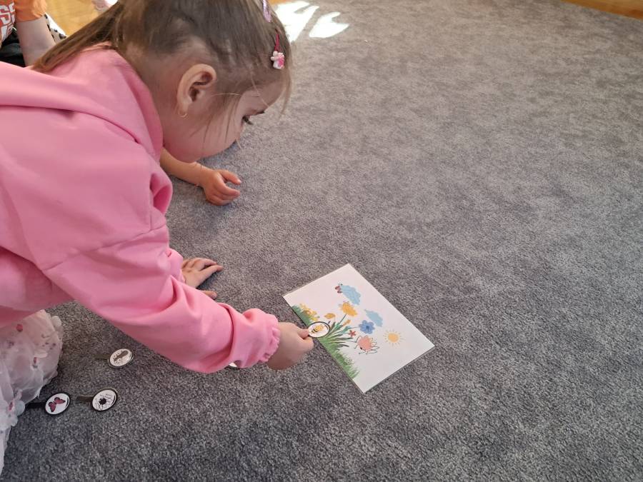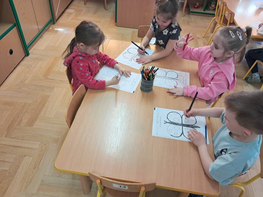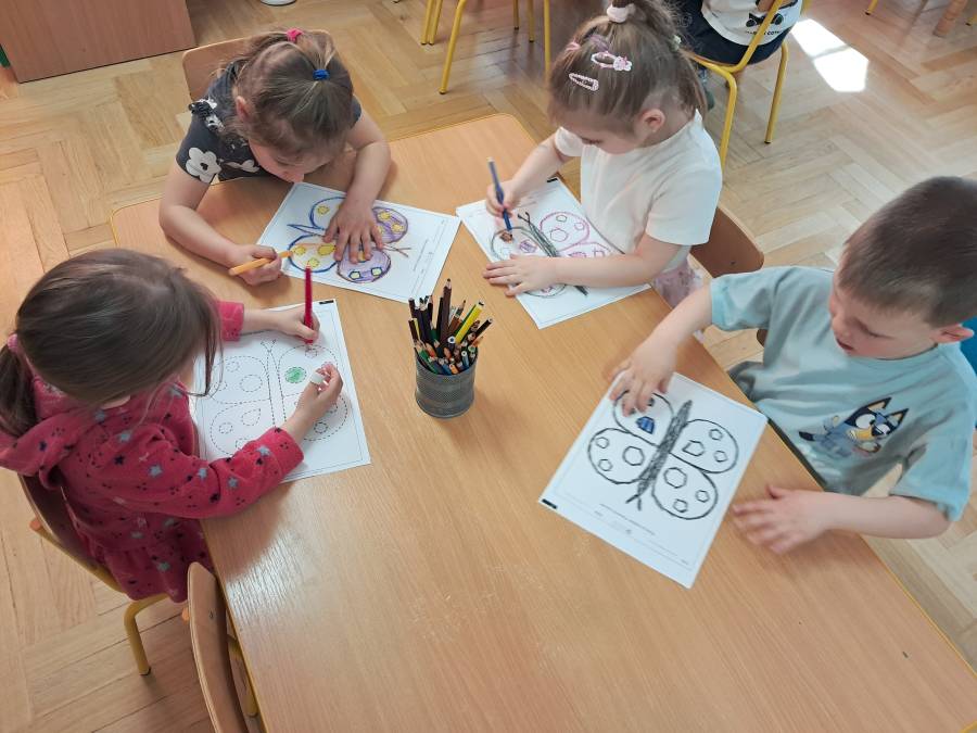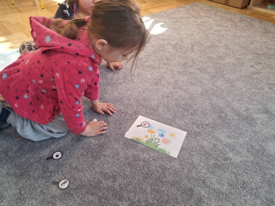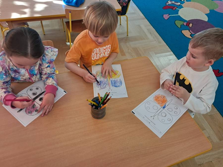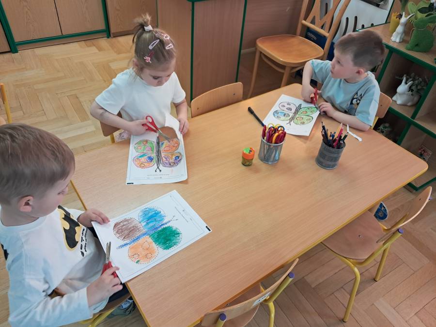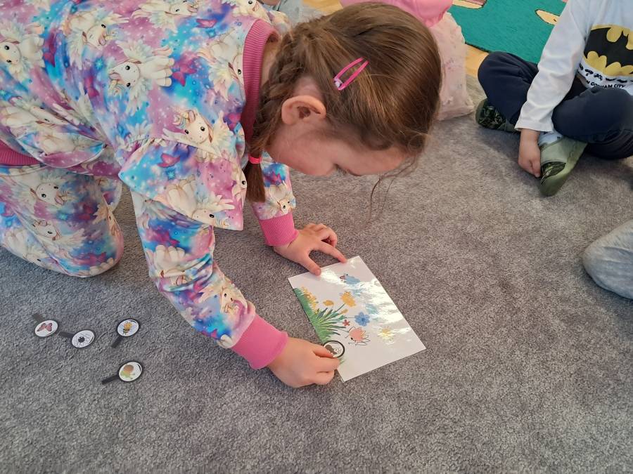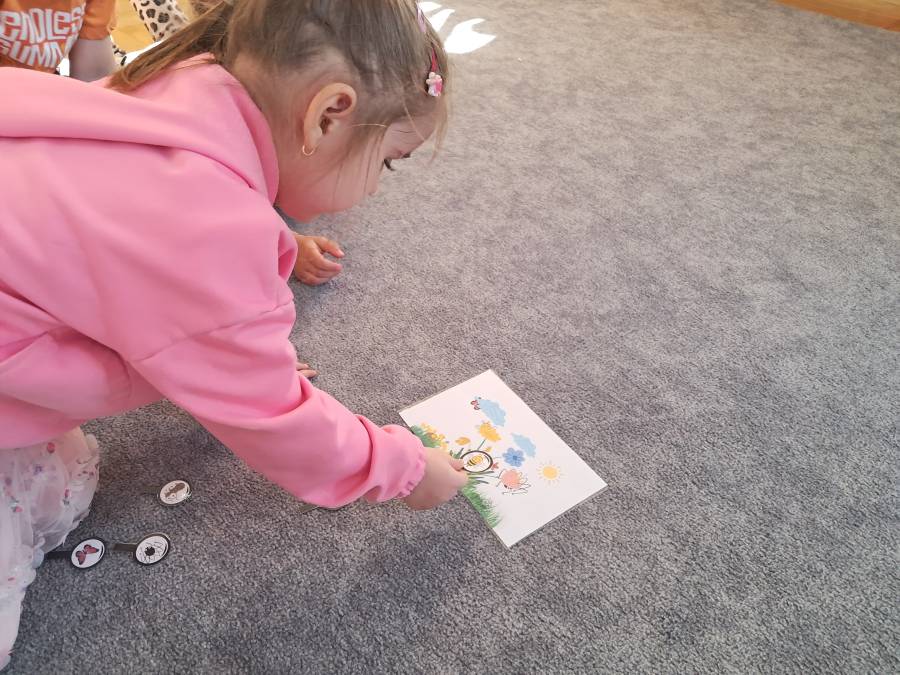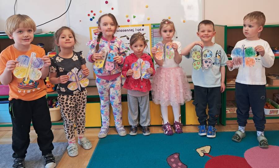 Żabki kontynuowały temat mieszkańców łąki, oglądając makietę łąki. Dzieci odszukiwały za pomocą lupy ukrytych mieszkańców łąki a na koniec pokolorowały i wycięły motylka ćwicząc motorykę małą. Wycięte motylki przez przedszkolaków ozdobiły naszą tablicę, która stała się bardziej wiosenna.