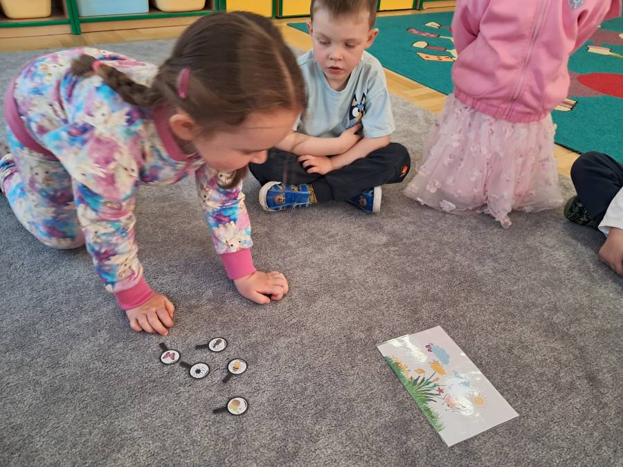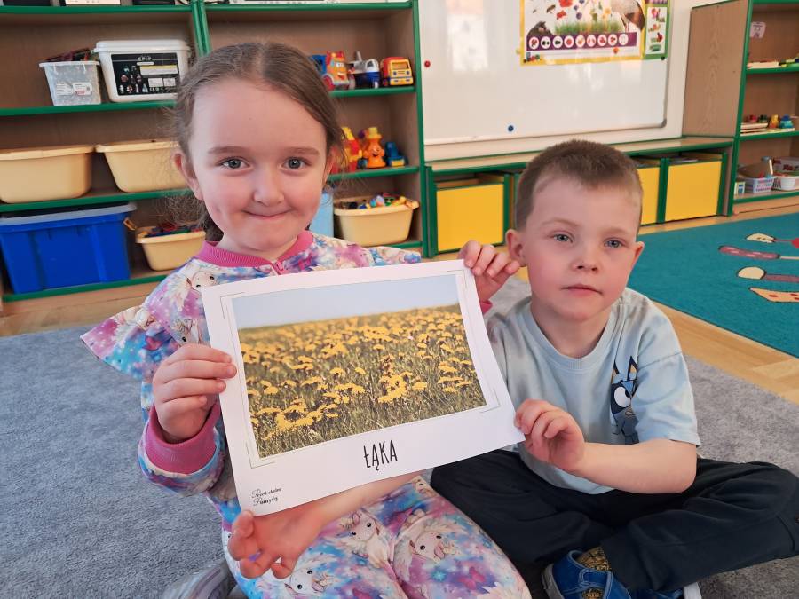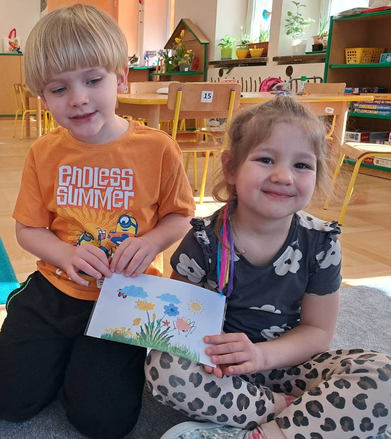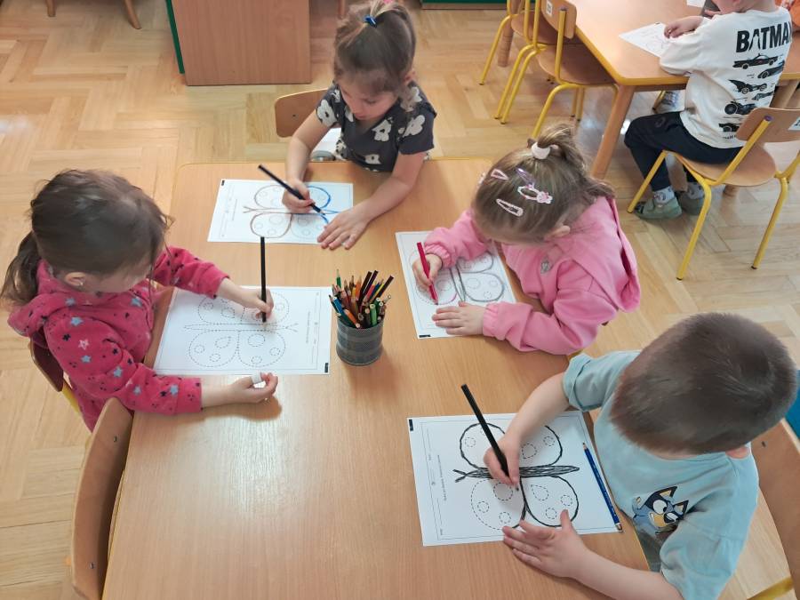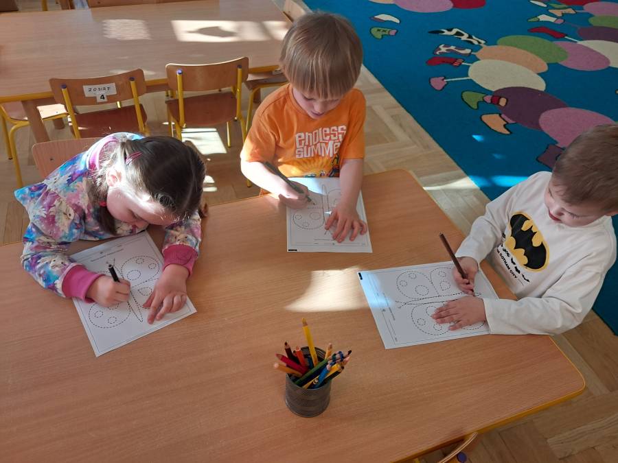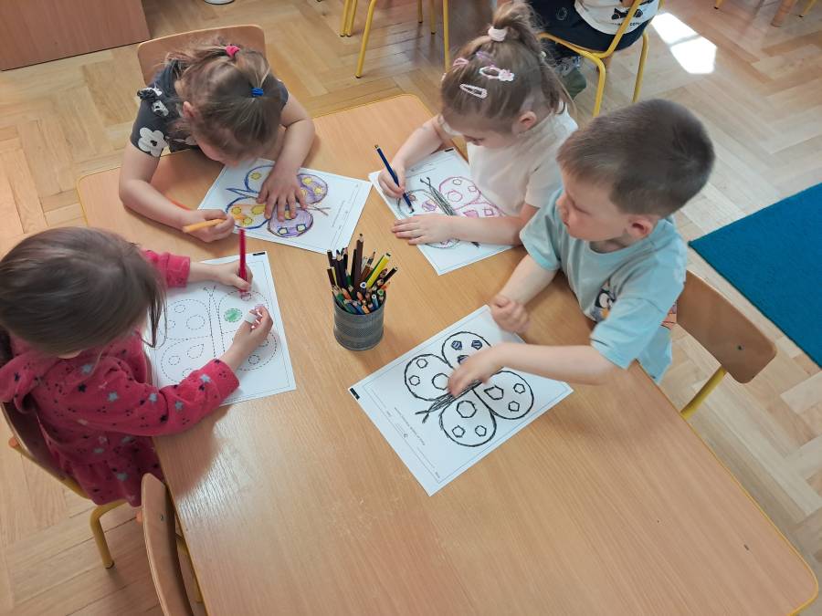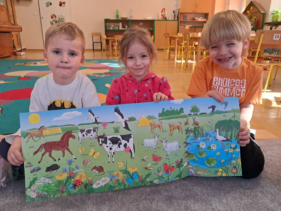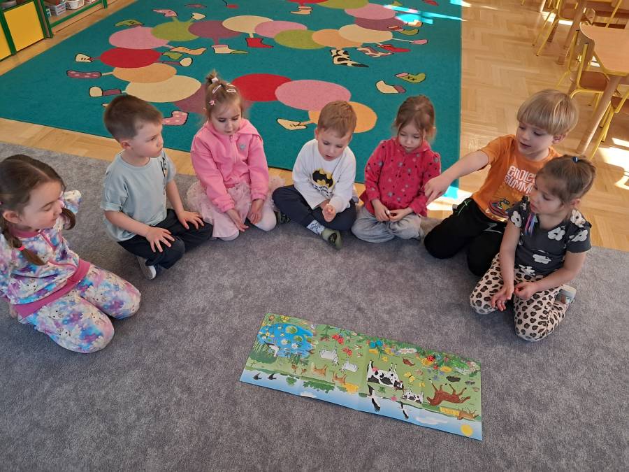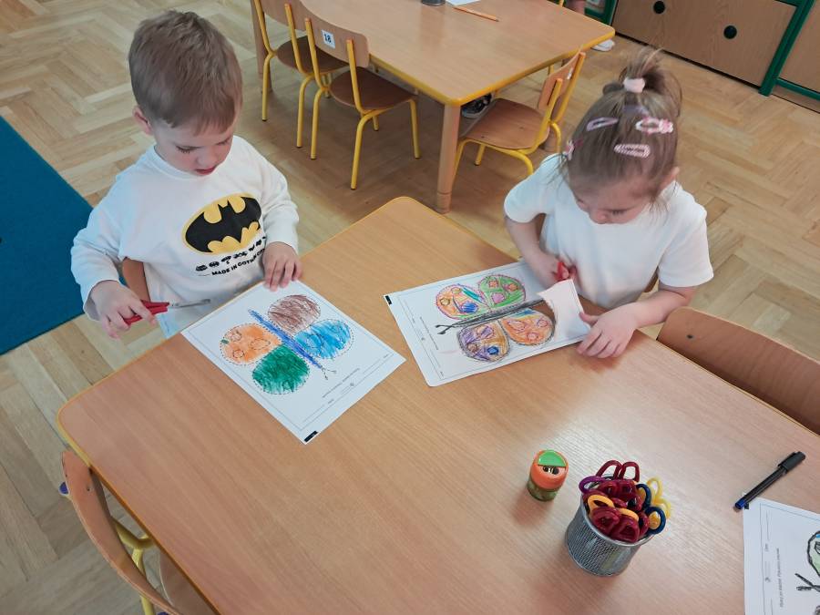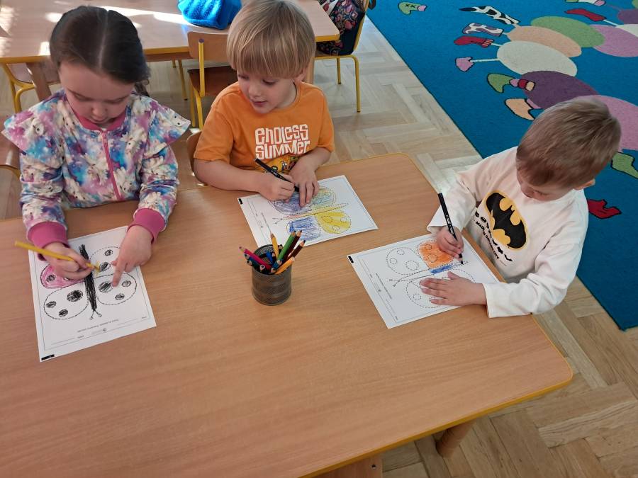 Żabki kontynuowały temat mieszkańców łąki, oglądając makietę łąki. Dzieci odszukiwały za pomocą lupy ukrytych mieszkańców łąki a na koniec pokolorowały i wycięły motylka ćwicząc motorykę małą. Wycięte motylki przez przedszkolaków ozdobiły naszą tablicę, która stała się bardziej wiosenna.