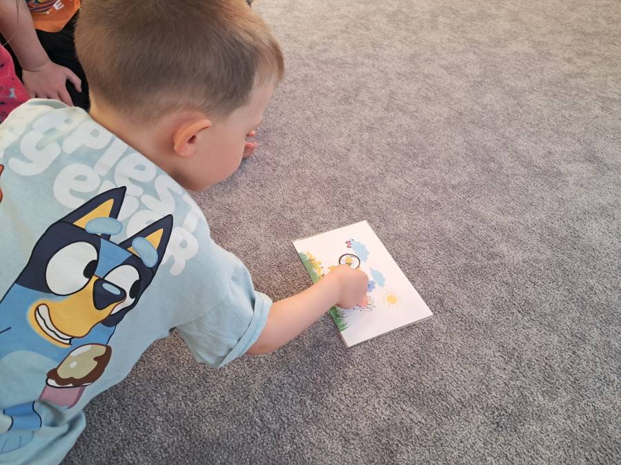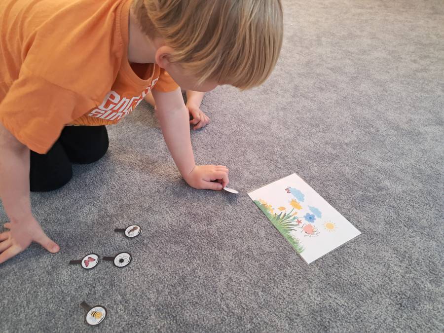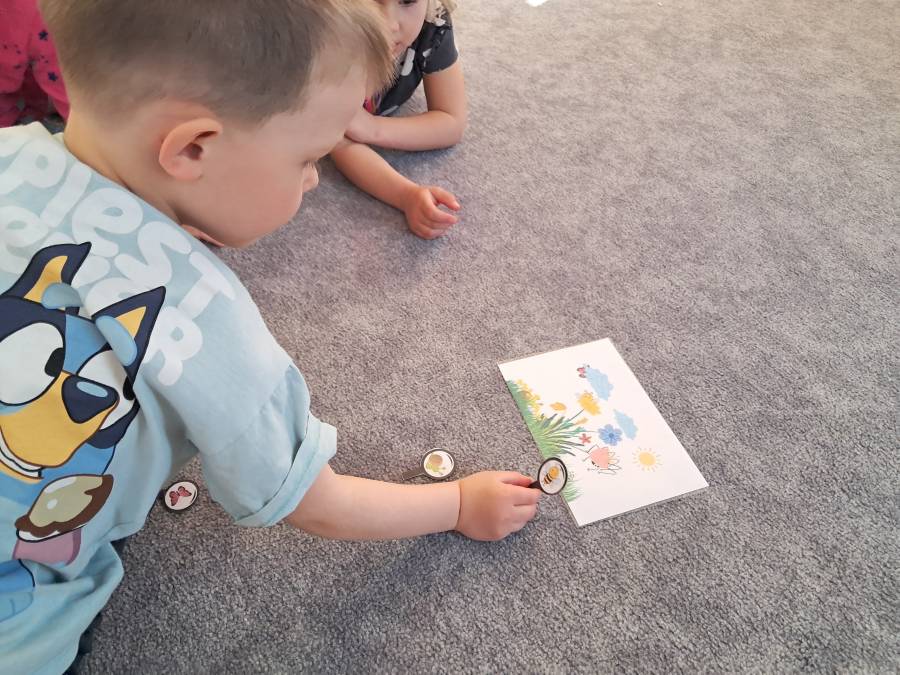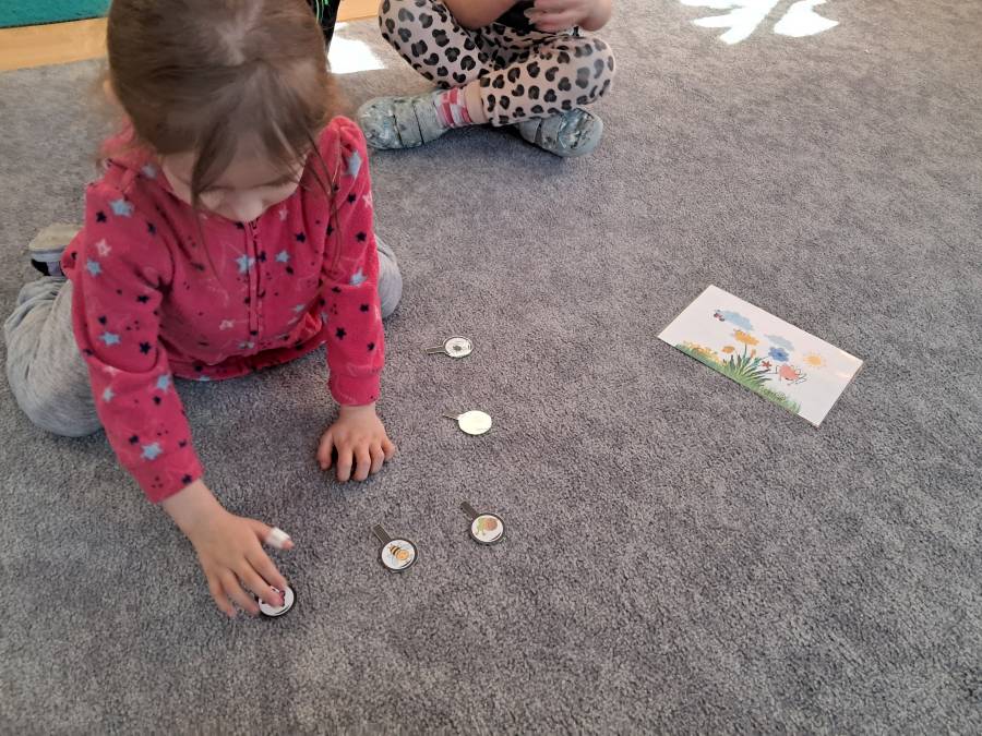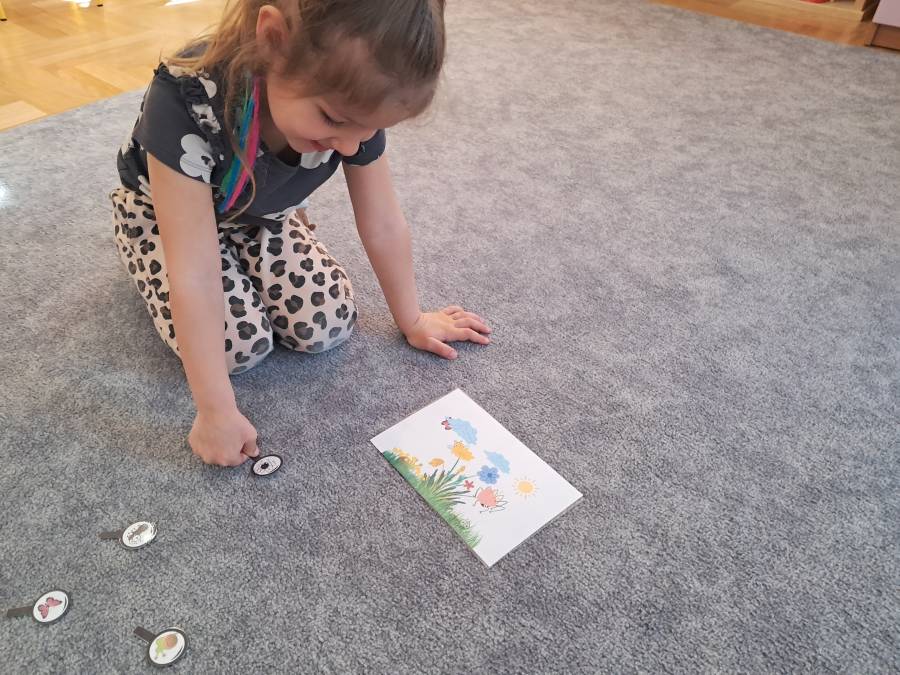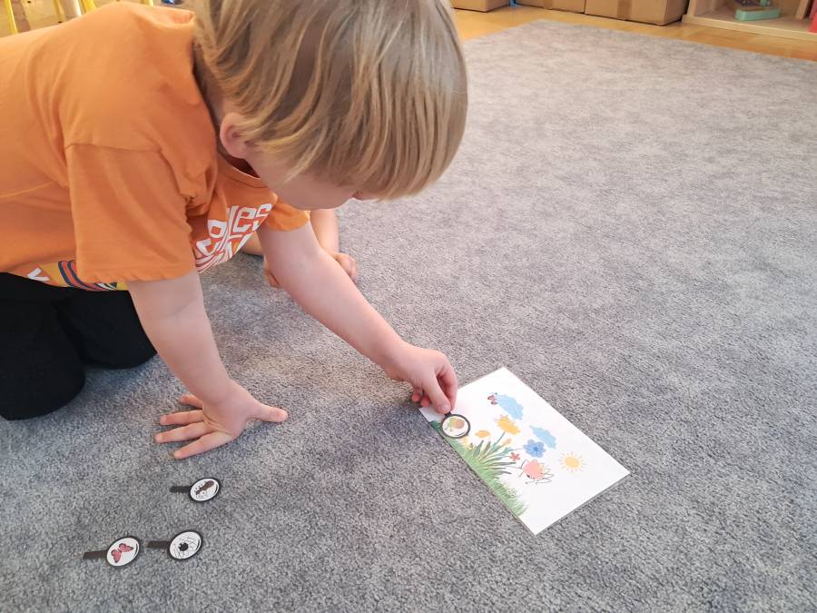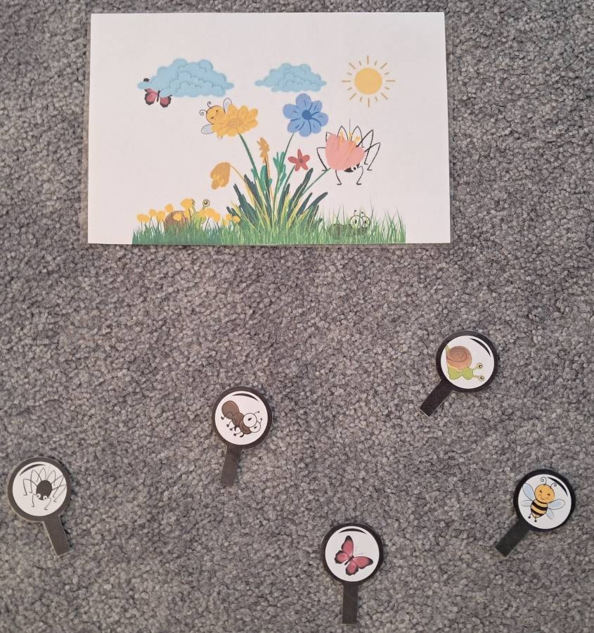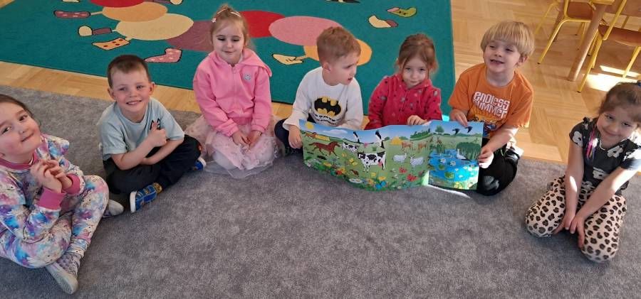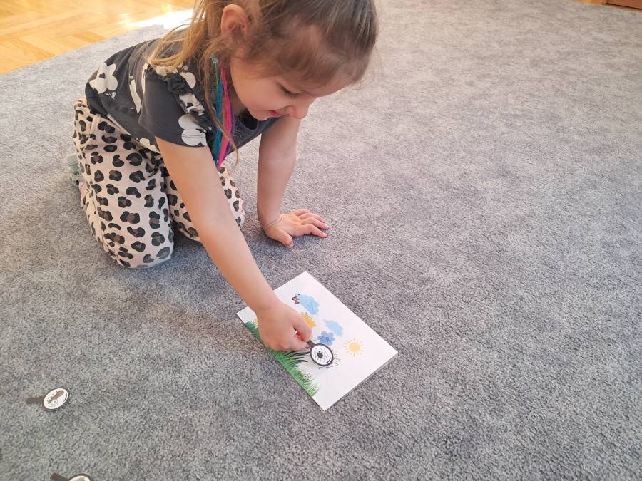 Żabki kontynuowały temat mieszkańców łąki, oglądając makietę łąki. Dzieci odszukiwały za pomocą lupy ukrytych mieszkańców łąki a na koniec pokolorowały i wycięły motylka ćwicząc motorykę małą. Wycięte motylki przez przedszkolaków ozdobiły naszą tablicę, która stała się bardziej wiosenna.