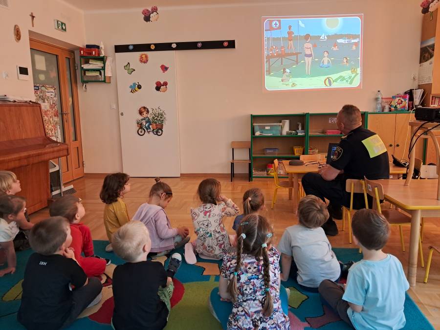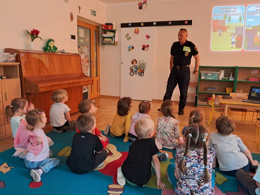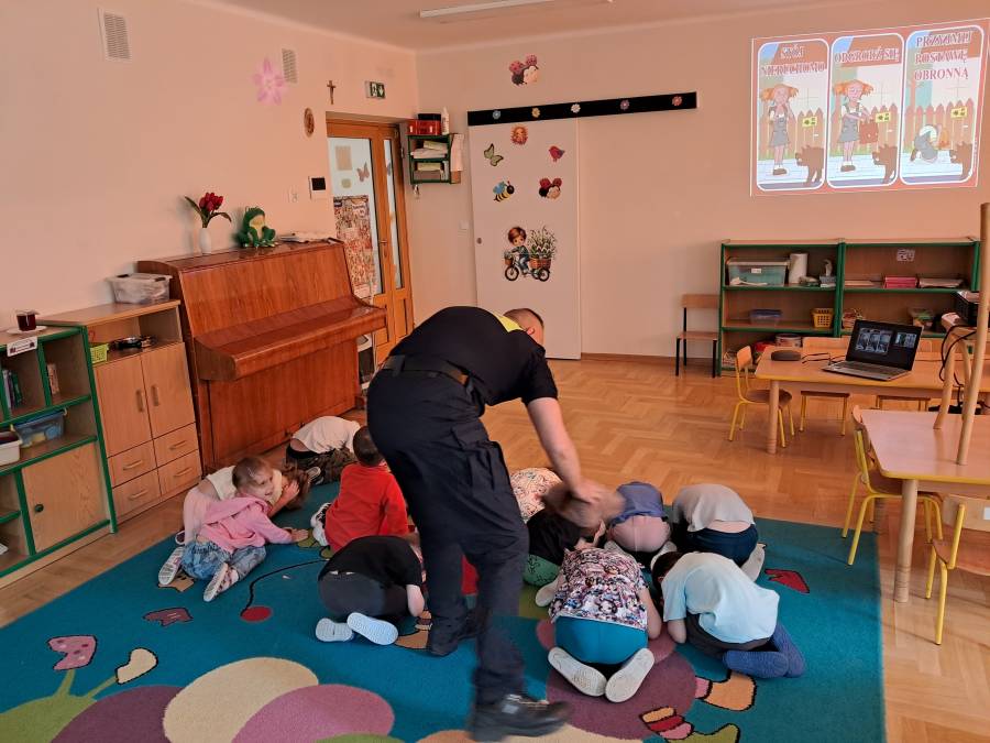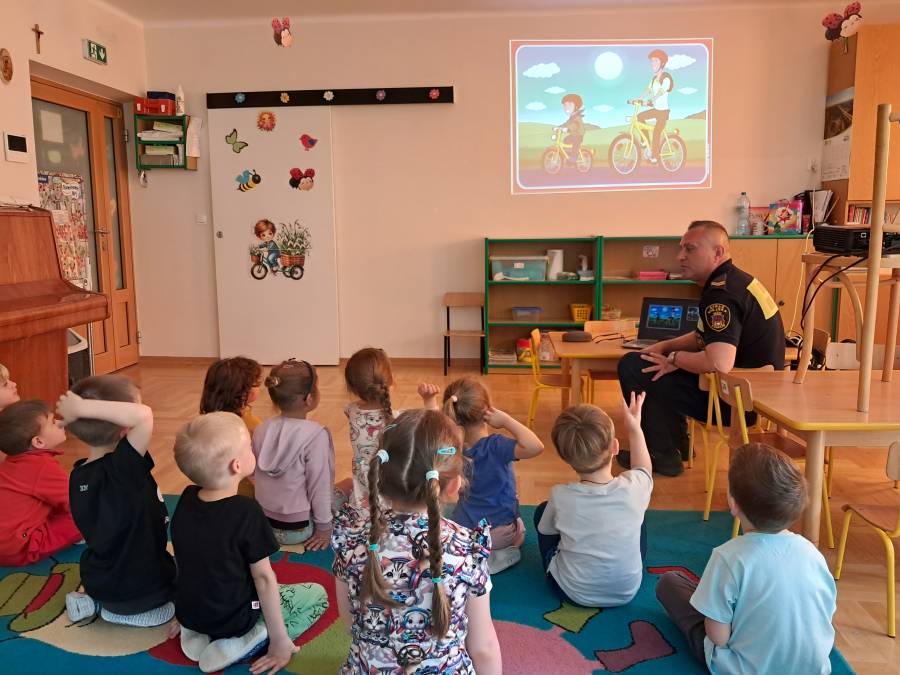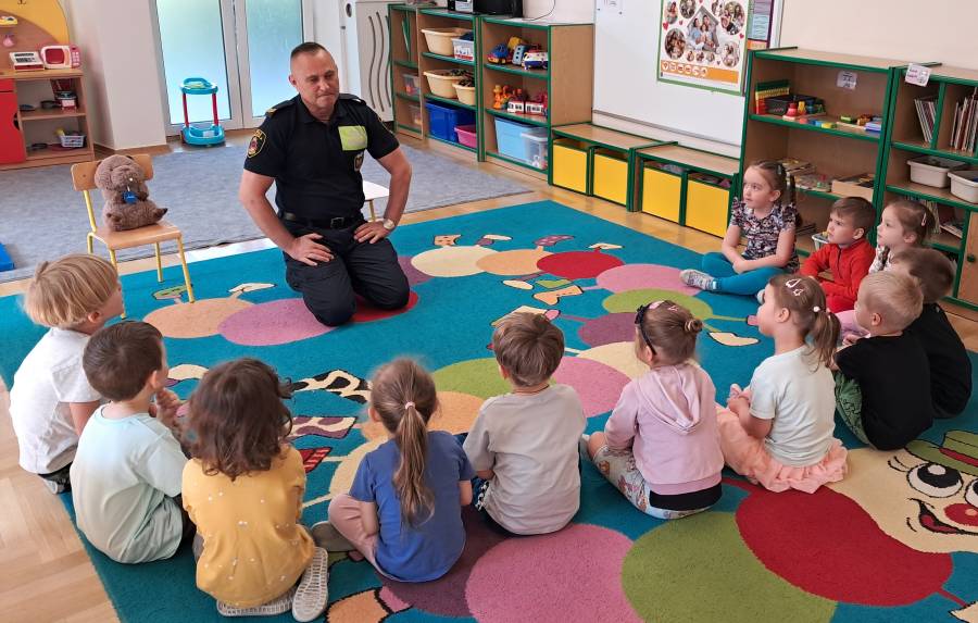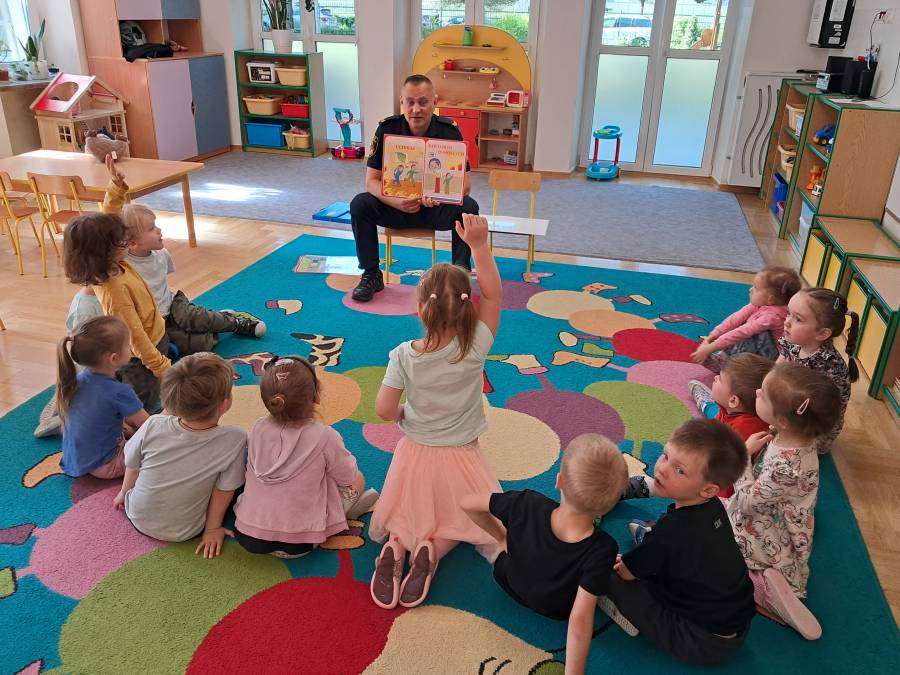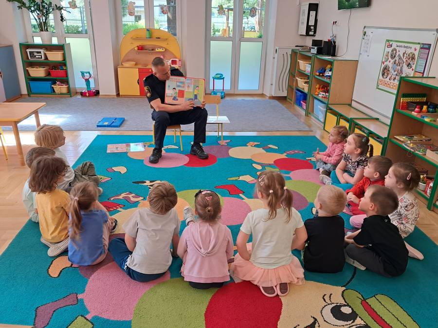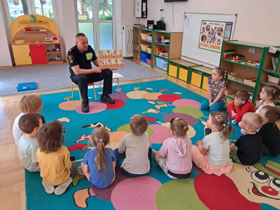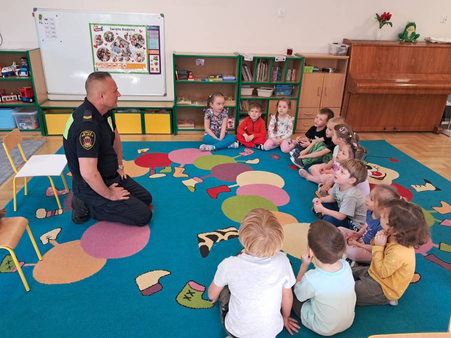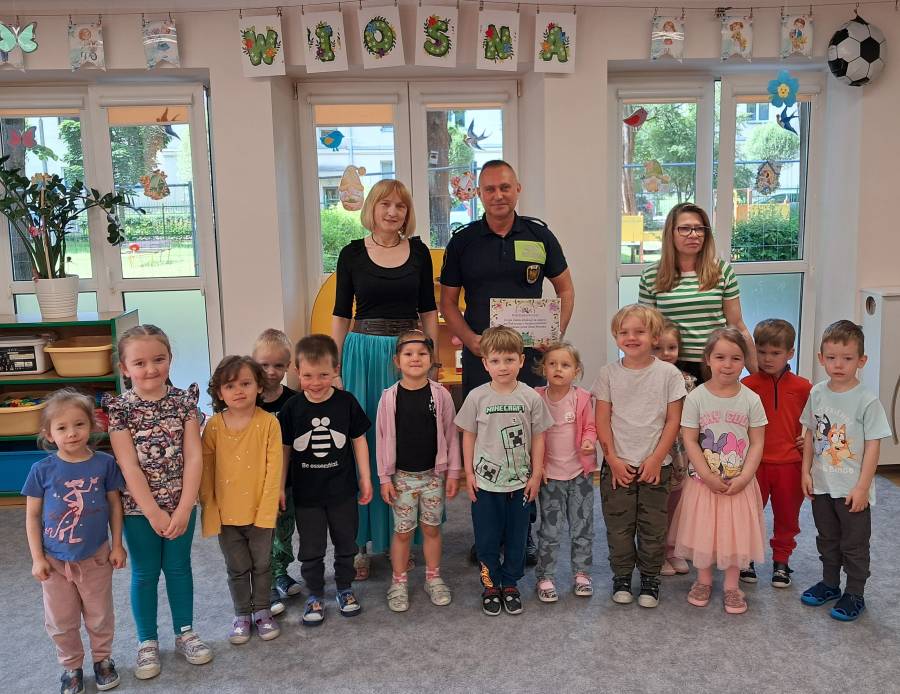 W dniu 30 maja mieliśmy przyjemność gościć w naszej grupie funkcjonariusza Straży Miejskiej. Przedszkolaki wzbogaciły swoją wiedzę na temat szeroko pojętego bezpieczeństwa podczas wiosny i wakacji. Dzieci miały także okazję znaleźć odpowiedź na pytanie: czy mogą bawić się z psem, którego nie znają?, jak się zachować gdy nas chce zaatakować pies? itp. Na zakończenie wizyty, dzieci wręczyły podziękowanie strażnikowi za pouczającą lekcję i wspólnie pozowały do pamiątkowego zdjęcia. Spotkanie było nie tylko okazją do nauki, ale także do budowania pozytywnego wizerunku służb mundurowych wśród najmłodszych.