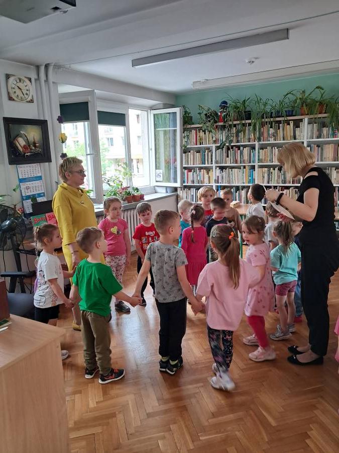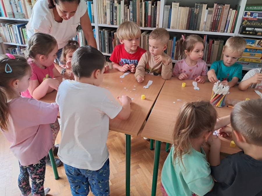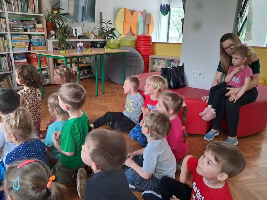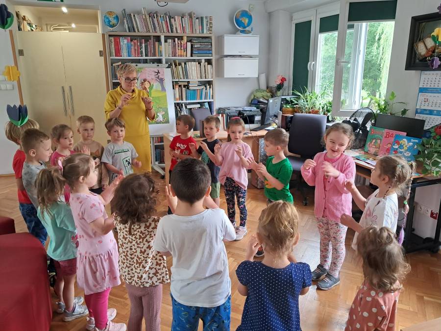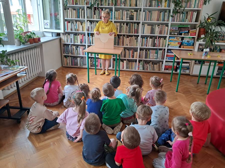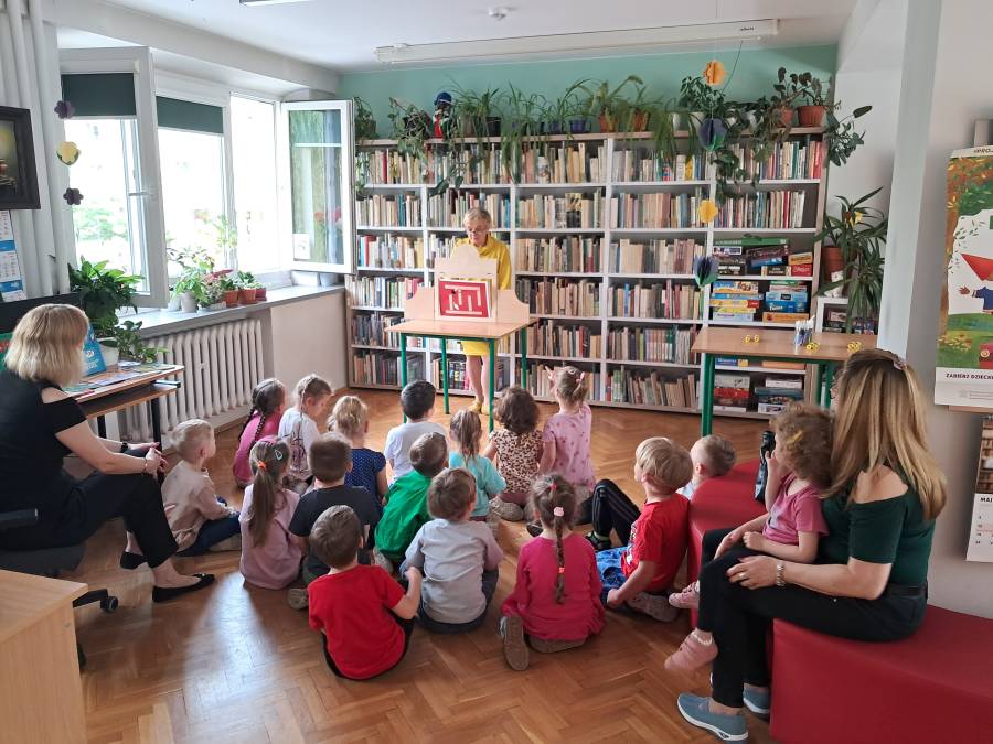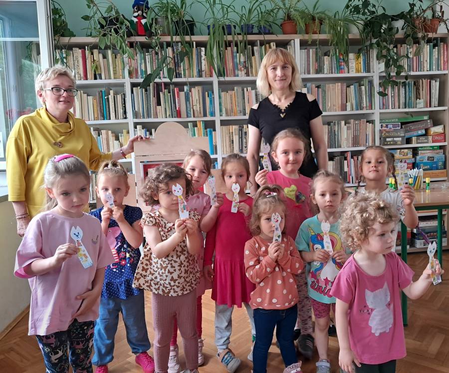 Grupa Żabki została zaproszona w ramach kampanii Cała Polska czyta dzieciom do biblioteki aby wysłuchać bajki metodą japońską czyli przy użyciu teatrzyku Kamishibai (opowiadanie bajek z ilustracjami). Przedszkolaki po zakończonej bajce wykonały zakładki do książek w kształcie kotka a na zakończenie zajęć zgadywały zwierzęta, zaczynającą się na podaną literę.