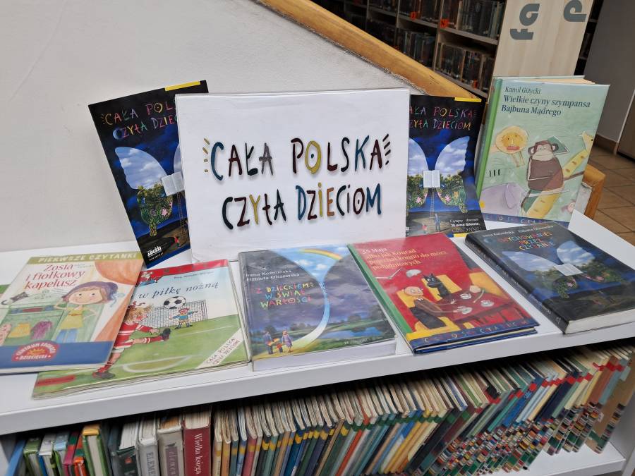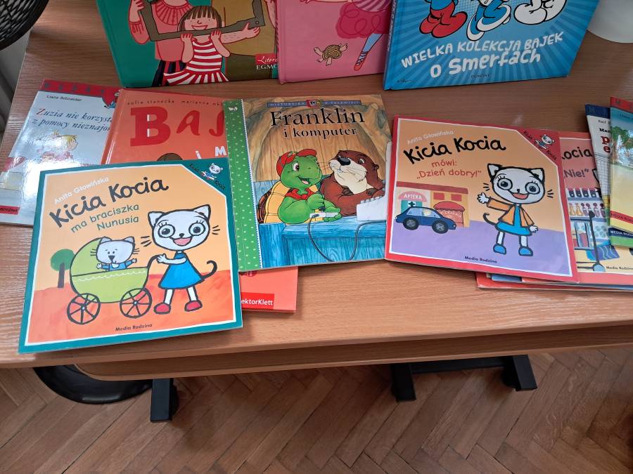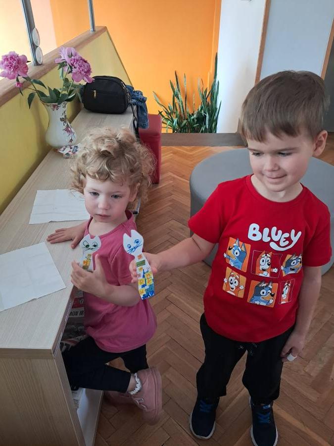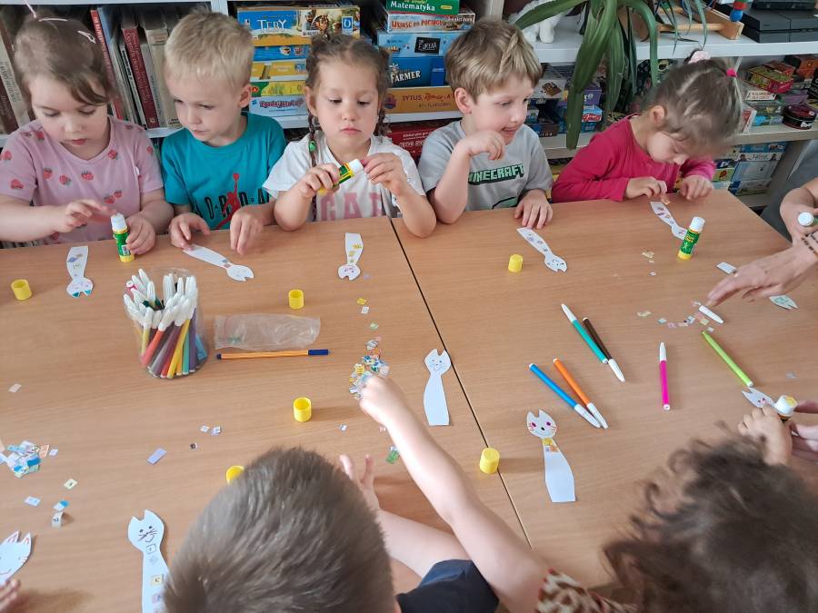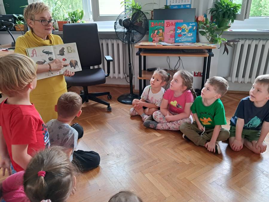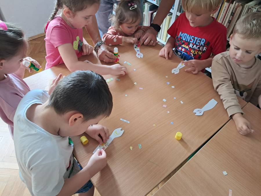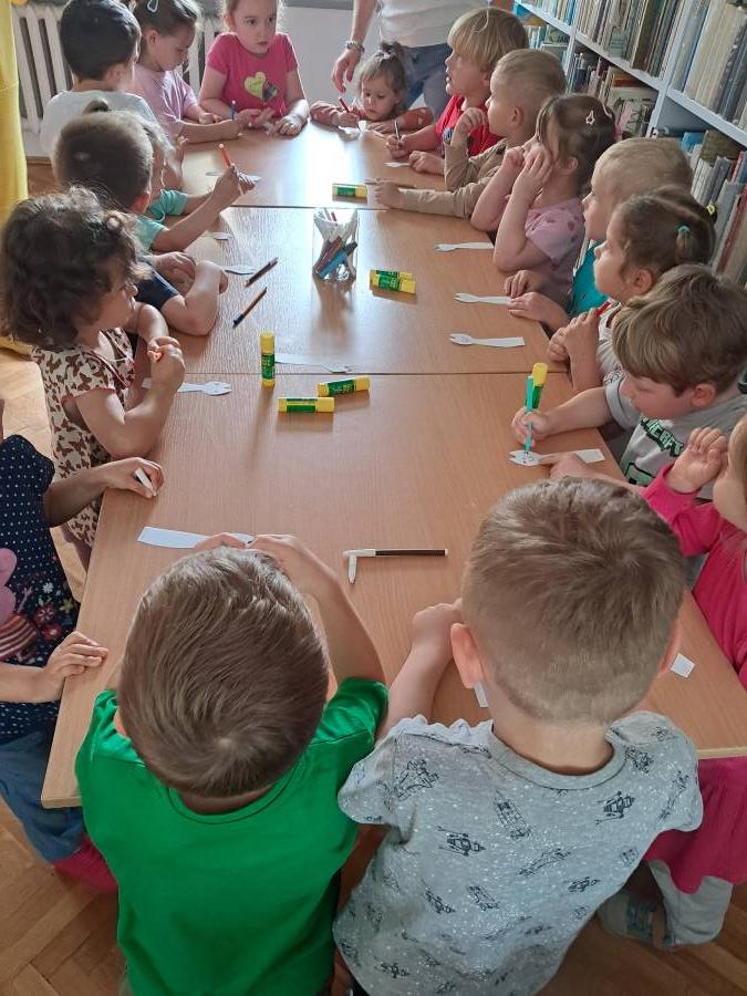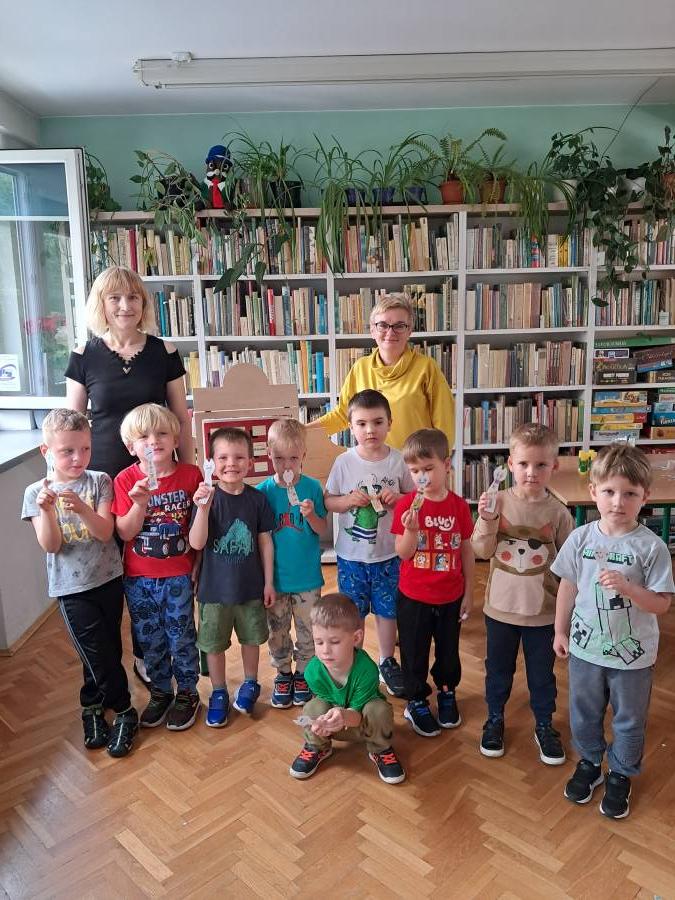 Grupa Żabki została zaproszona w ramach kampanii Cała Polska czyta dzieciom do biblioteki aby wysłuchać bajki metodą japońską czyli przy użyciu teatrzyku Kamishibai (opowiadanie bajek z ilustracjami). Przedszkolaki po zakończonej bajce wykonały zakładki do książek w kształcie kotka a na zakończenie zajęć zgadywały zwierzęta, zaczynającą się na podaną literę.