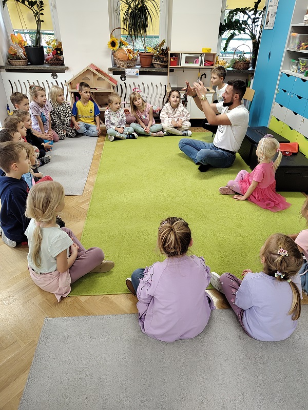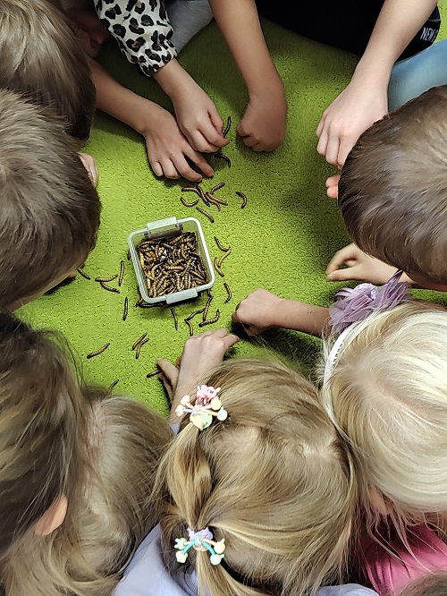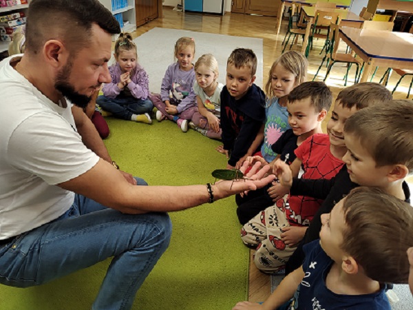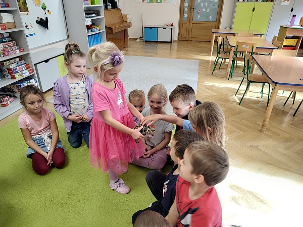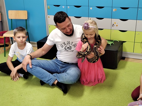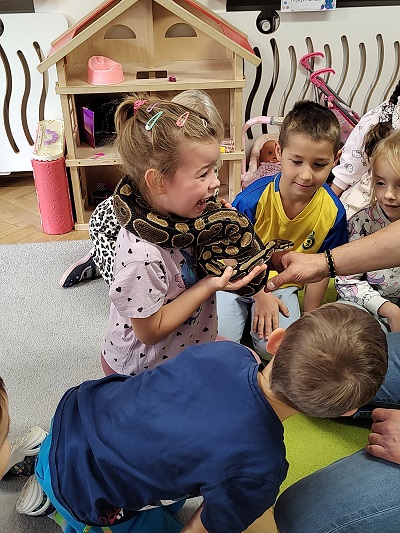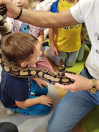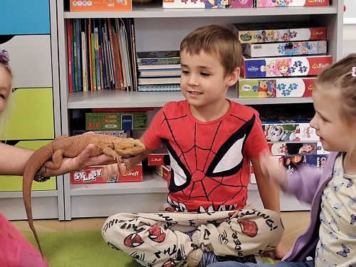 Dnia 15.10.2025, tata Ali przyszedł do Motylków z Żywą Lekcją Przyrody by pokazać niezwykłe, egzotyczne zwierzęta. Motylki miały możliwość zobaczyć z bliska kameleona, pytona afrykańskiego, żółwia greckiego, pająka ptasznika kędzierzawego oraz agamę brodatą.