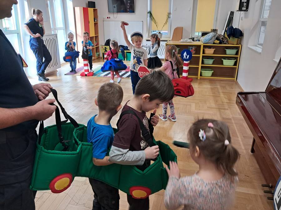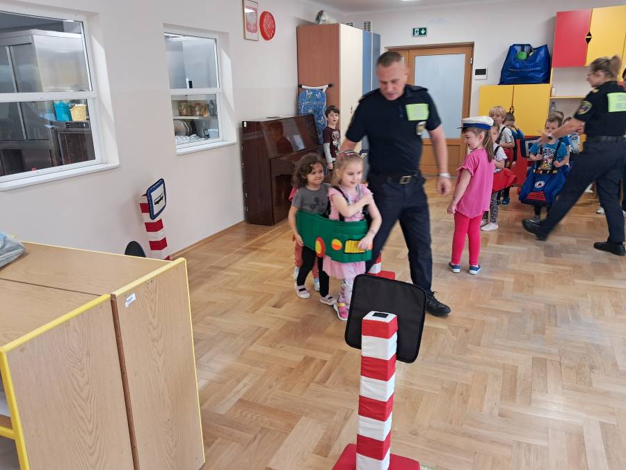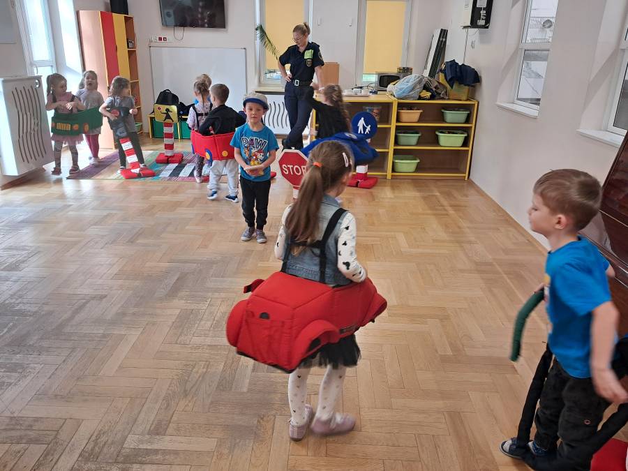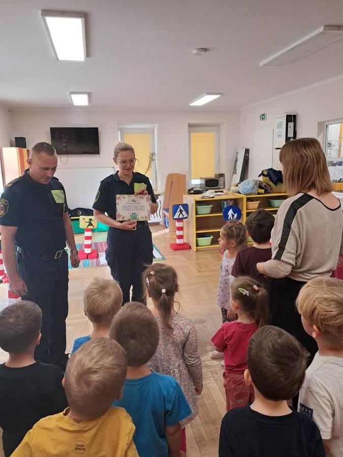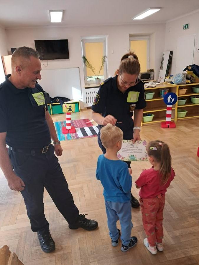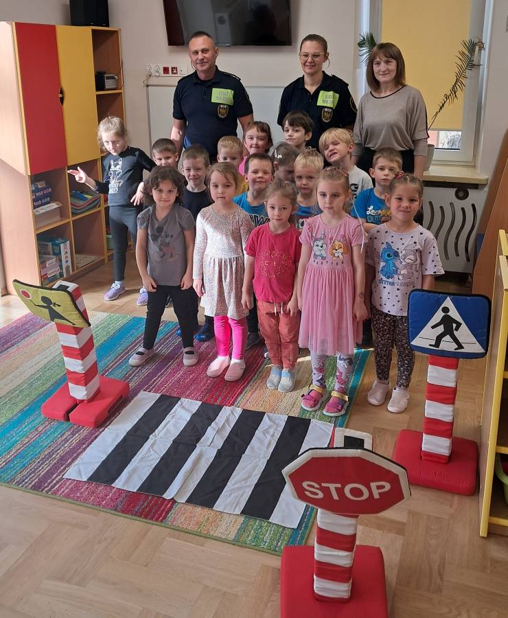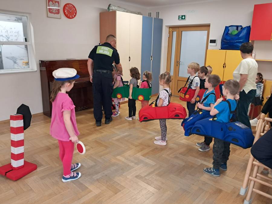 Dnia 30 października 2025r. w naszym przedszkolu mieliśmy okazję gościć na zajęciach funkcjonariuszy Straży Miejskiej. Celem przeprowadzonych zajęć było poszerzenie wiedzy wśród przedszkolaków na temat obowiązujących zasad bezpieczeństwa na ulicy. Poprzez wspaniałą zabawę w "miasteczku ruchu drogowego" Żabki utrwaliły zasady bezpiecznego poruszania się po drodze przy pomocy "autochodzików". W podziękowaniu za atrakcyjne zajęcia i miłą atmosferę przedszkolaki wręczyły podziękowanie funkcjonariuszom.