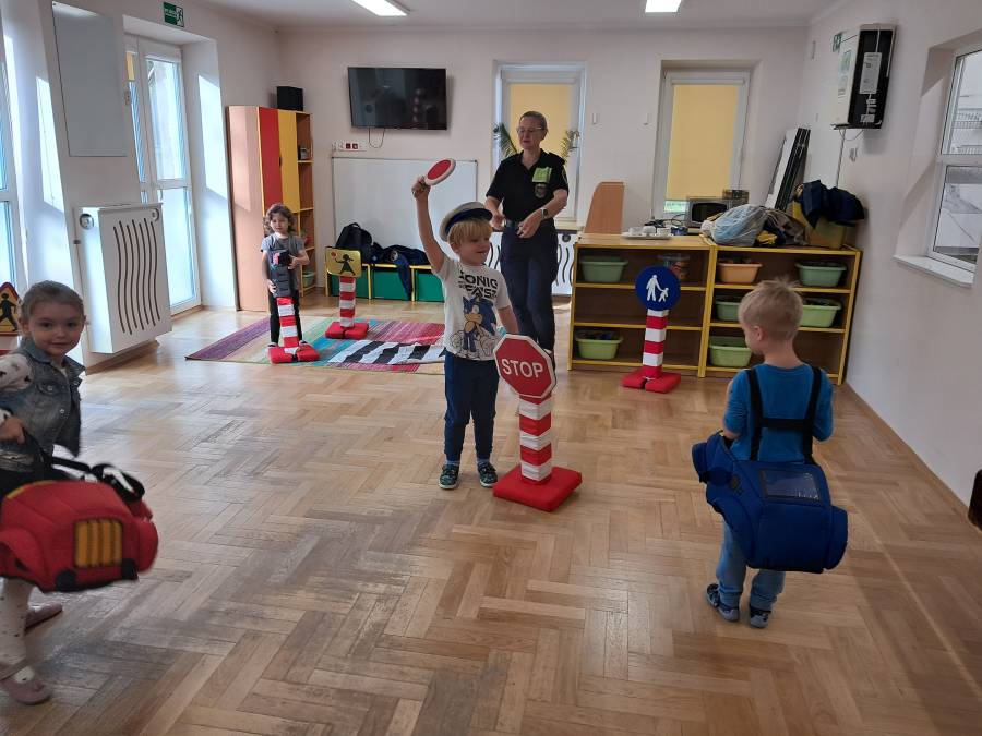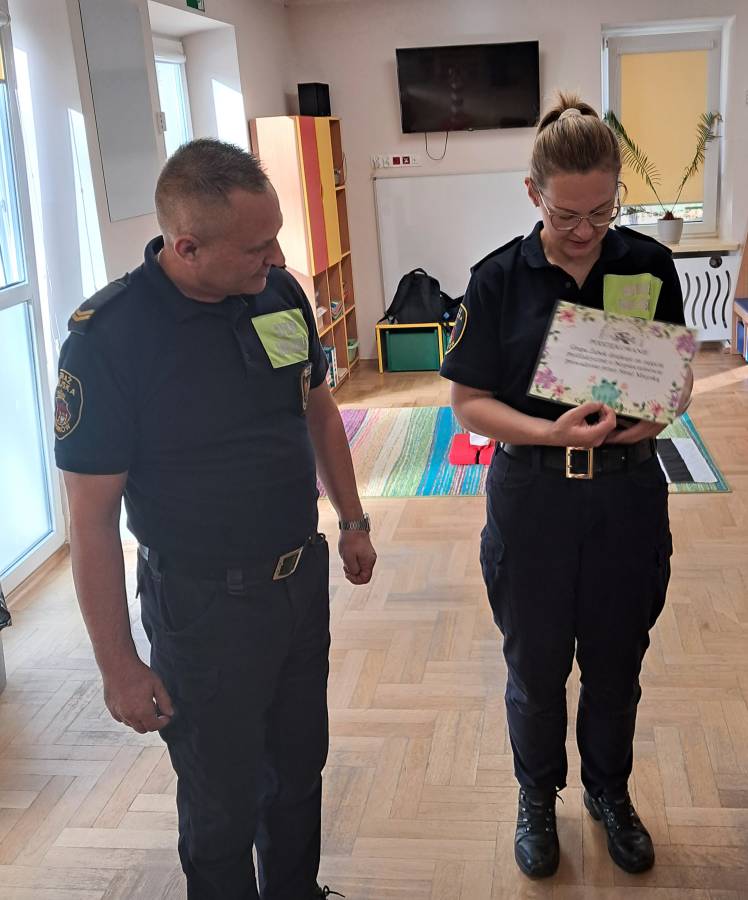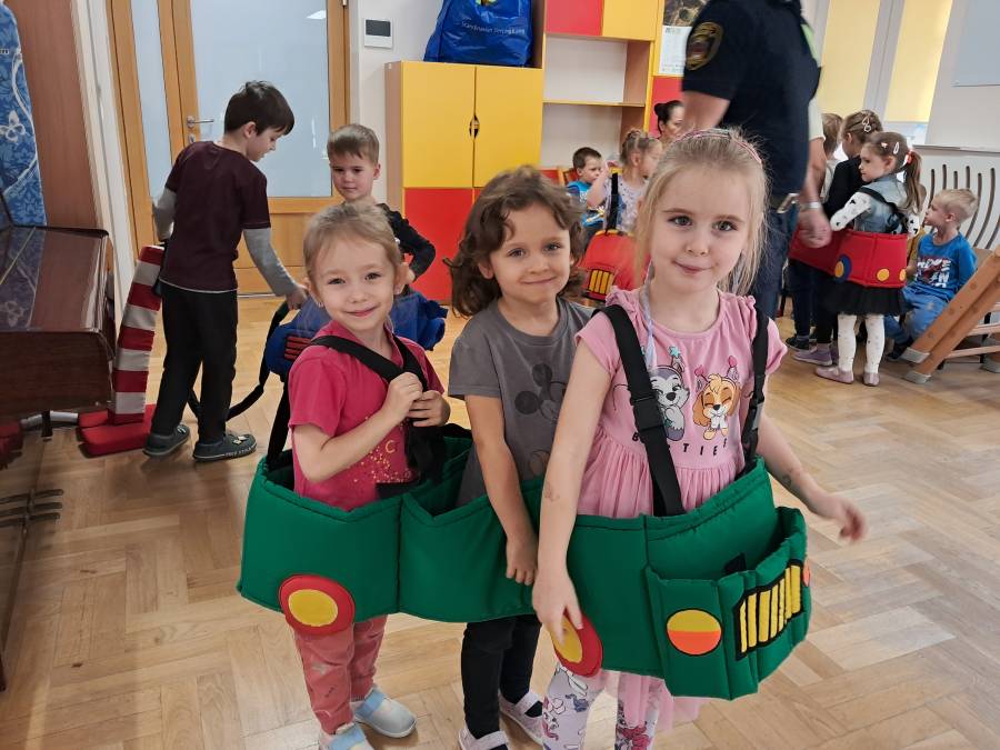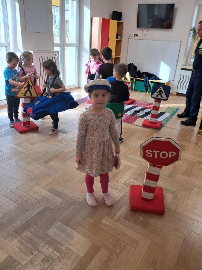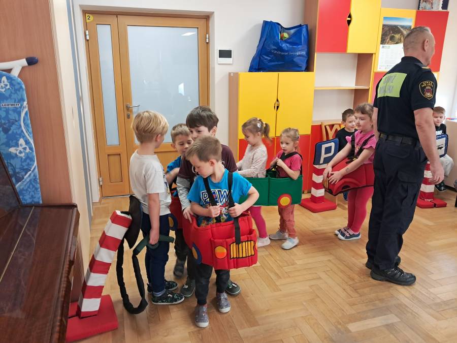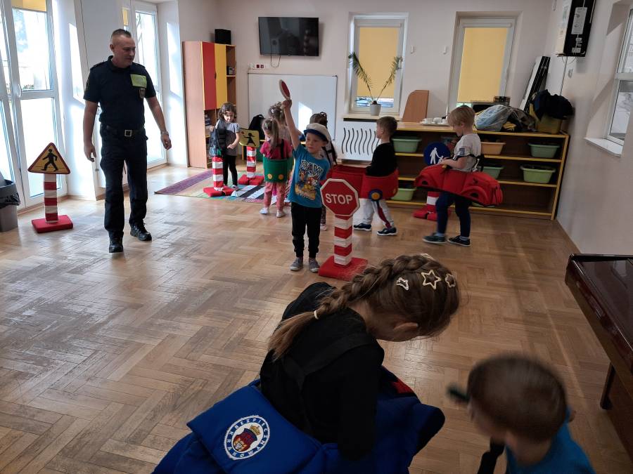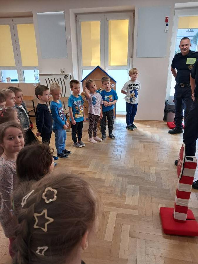 Dnia 30 października 2025r. w naszym przedszkolu mieliśmy okazję gościć na zajęciach funkcjonariuszy Straży Miejskiej. Celem przeprowadzonych zajęć było poszerzenie wiedzy wśród przedszkolaków na temat obowiązujących zasad bezpieczeństwa na ulicy. Poprzez wspaniałą zabawę w "miasteczku ruchu drogowego" Żabki utrwaliły zasady bezpiecznego poruszania się po drodze przy pomocy "autochodzików". W podziękowaniu za atrakcyjne zajęcia i miłą atmosferę przedszkolaki wręczyły podziękowanie funkcjonariuszom.