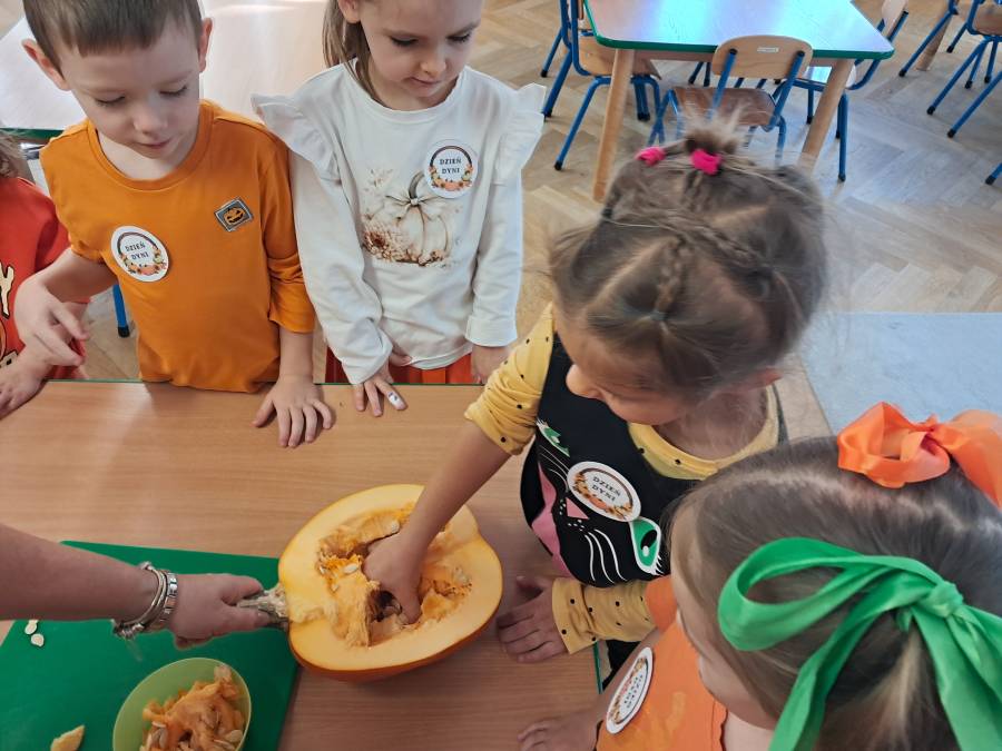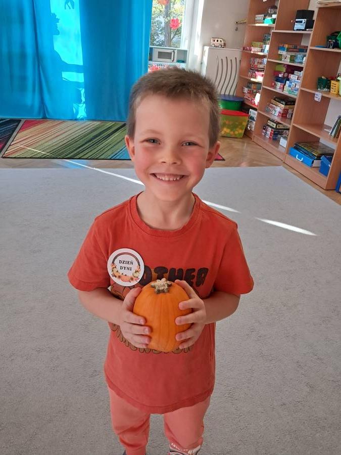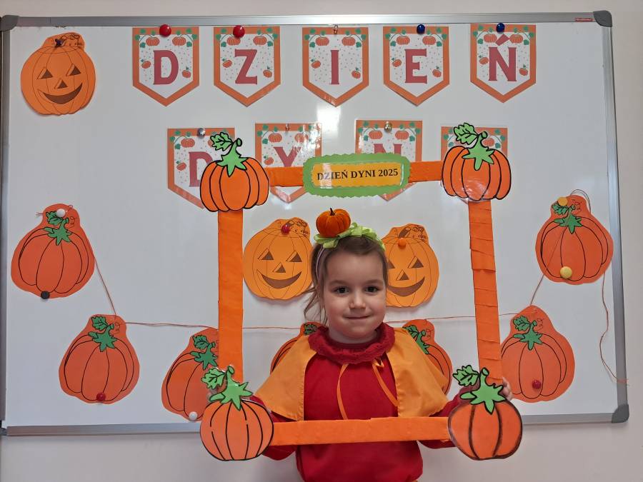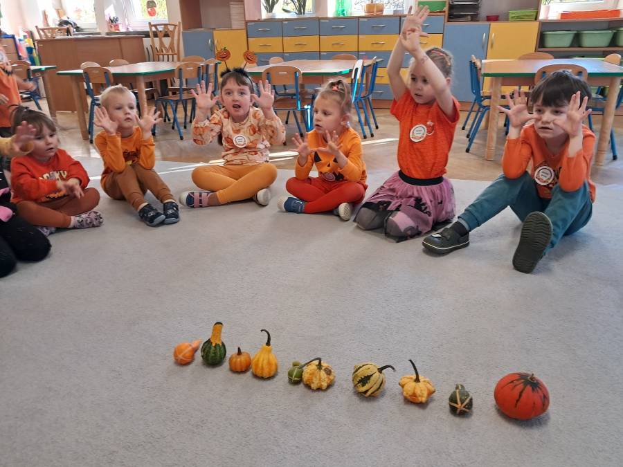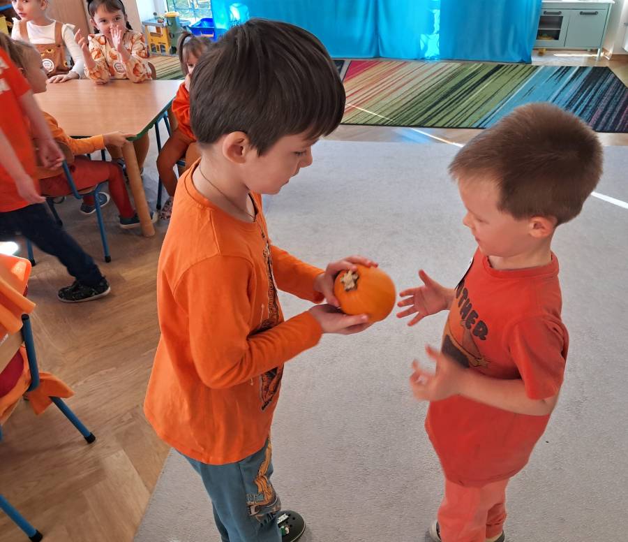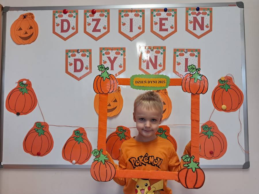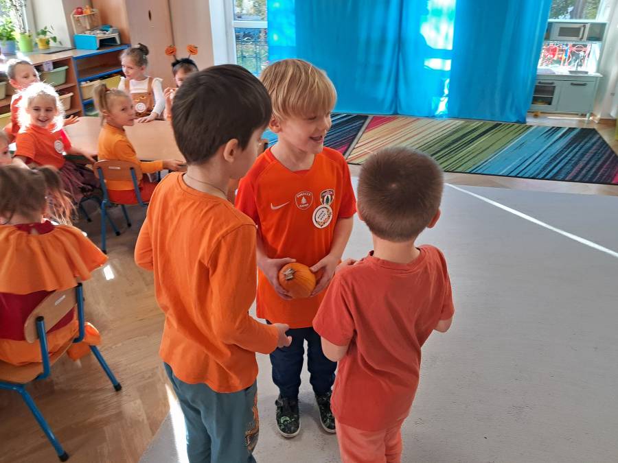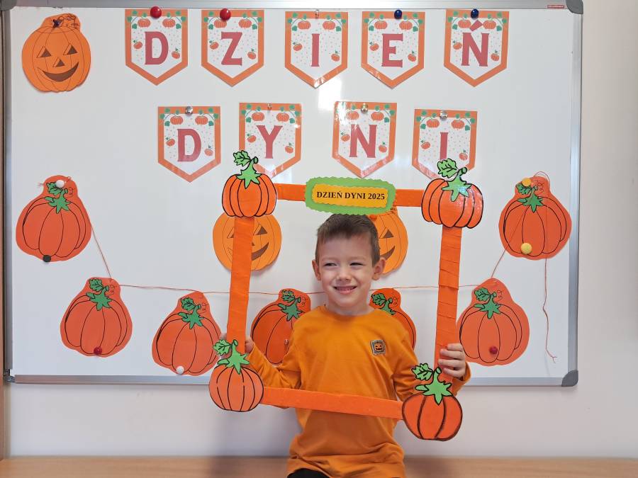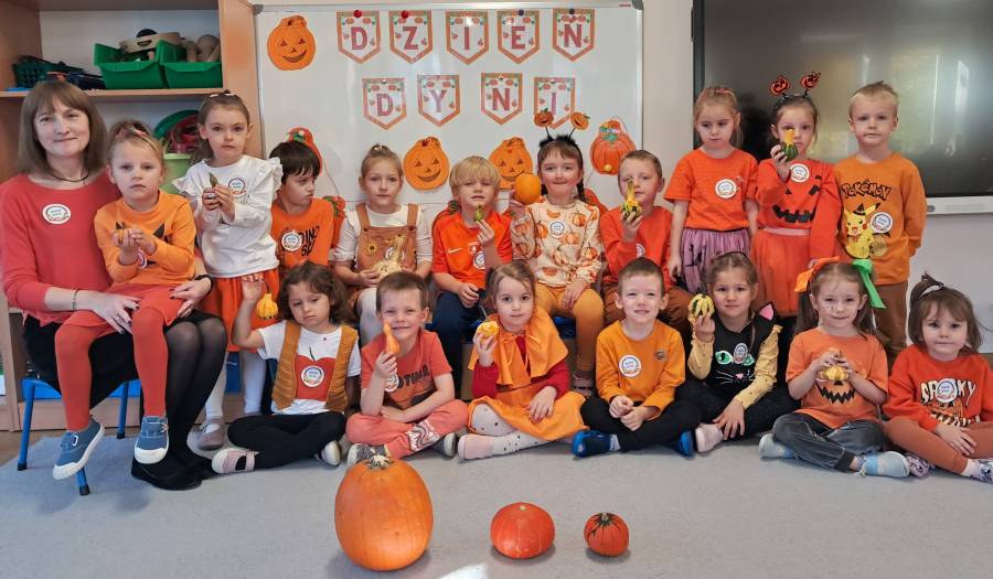 Dynia to bardzo zdrowe, wdzięczne i fajne do zabawy warzywo przekonały się o tym Żabki w piątek 31października 2025 w czasie obchodów Dnia Dyni. W tym dniu dzieci przyszły ubrane na kolor pomarańczowy, dowiedziały się jakie potrawy można przygotować z wykorzystaniem dyni. Przedszkolaki uczestniczyły w zabawie dyniowej opartej na muzyce i ruchu Wędrująca dynia, dopasowywały cienie dyń, miały możliwość zobaczyć jak wygląda dynia w środku i wyciągać jej zawartość. Ten dzień był pełen wrażeń i radości.