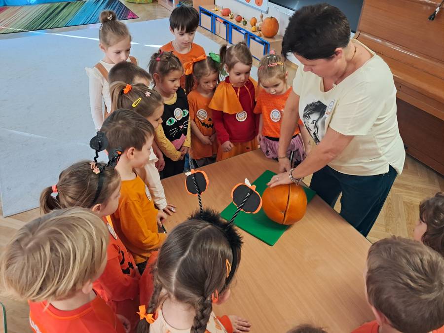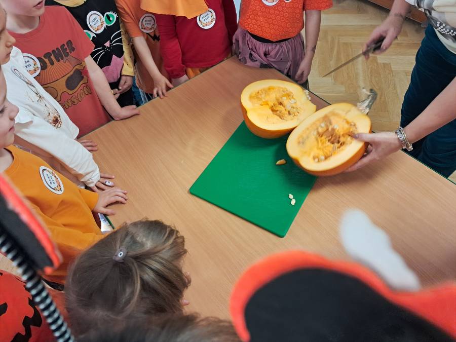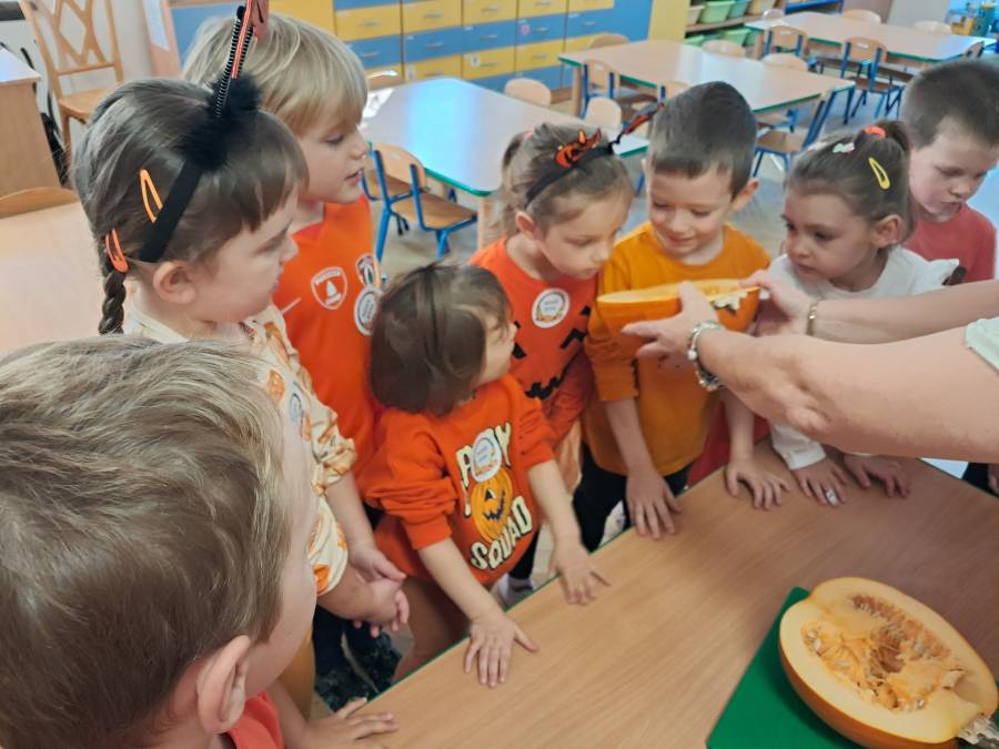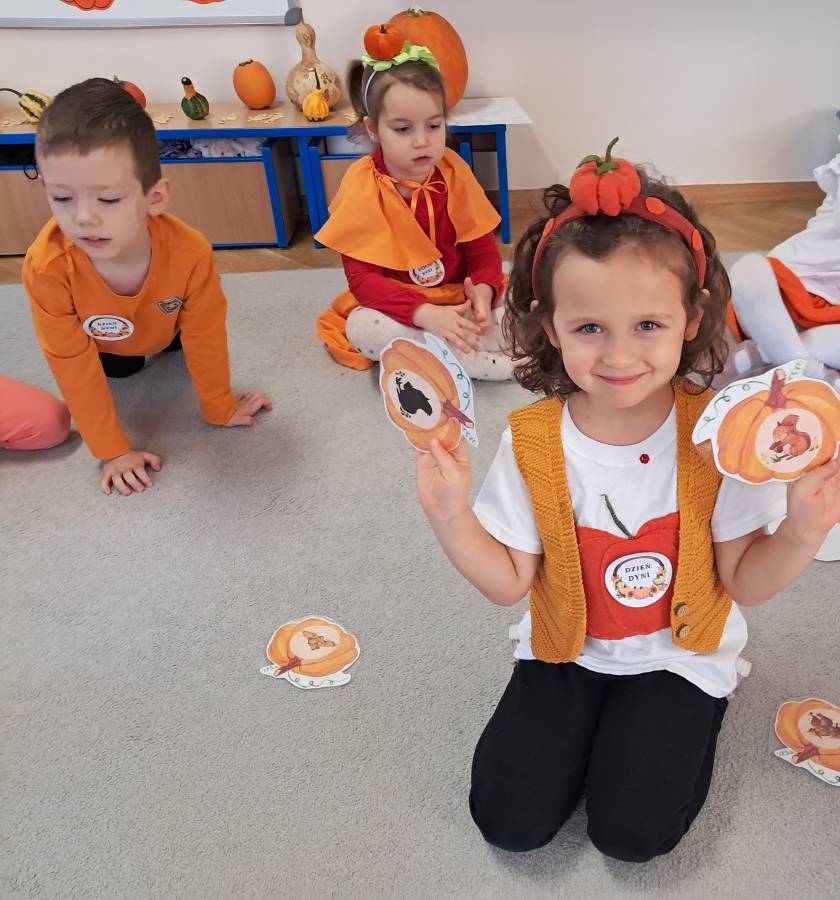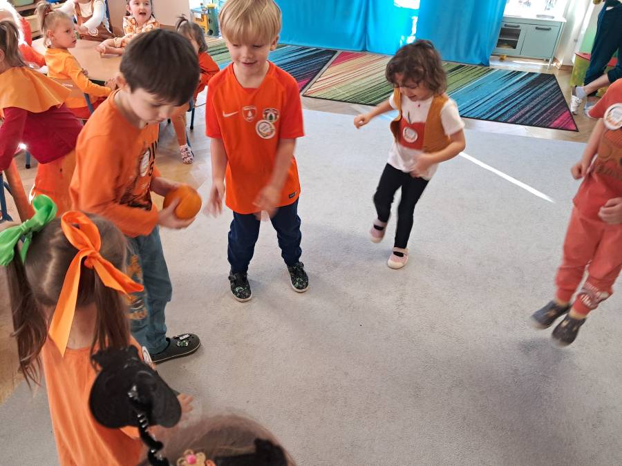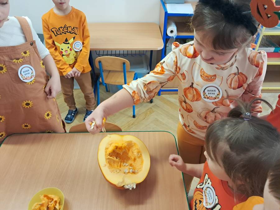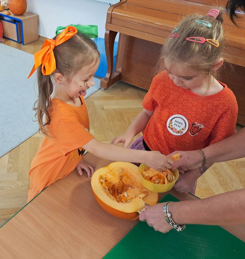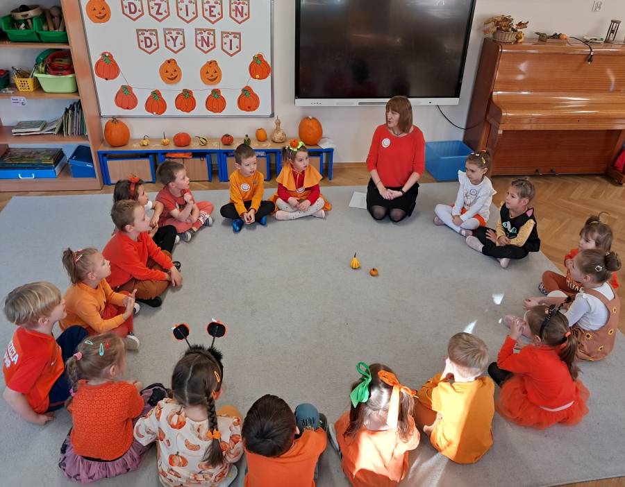 Dynia to bardzo zdrowe, wdzięczne i fajne do zabawy warzywo przekonały się o tym Żabki w piątek 31października 2025 w czasie obchodów Dnia Dyni. W tym dniu dzieci przyszły ubrane na kolor pomarańczowy, dowiedziały się jakie potrawy można przygotować z wykorzystaniem dyni. Przedszkolaki uczestniczyły w zabawie dyniowej opartej na muzyce i ruchu Wędrująca dynia, dopasowywały cienie dyń, miały możliwość zobaczyć jak wygląda dynia w środku i wyciągać jej zawartość. Ten dzień był pełen wrażeń i radości.