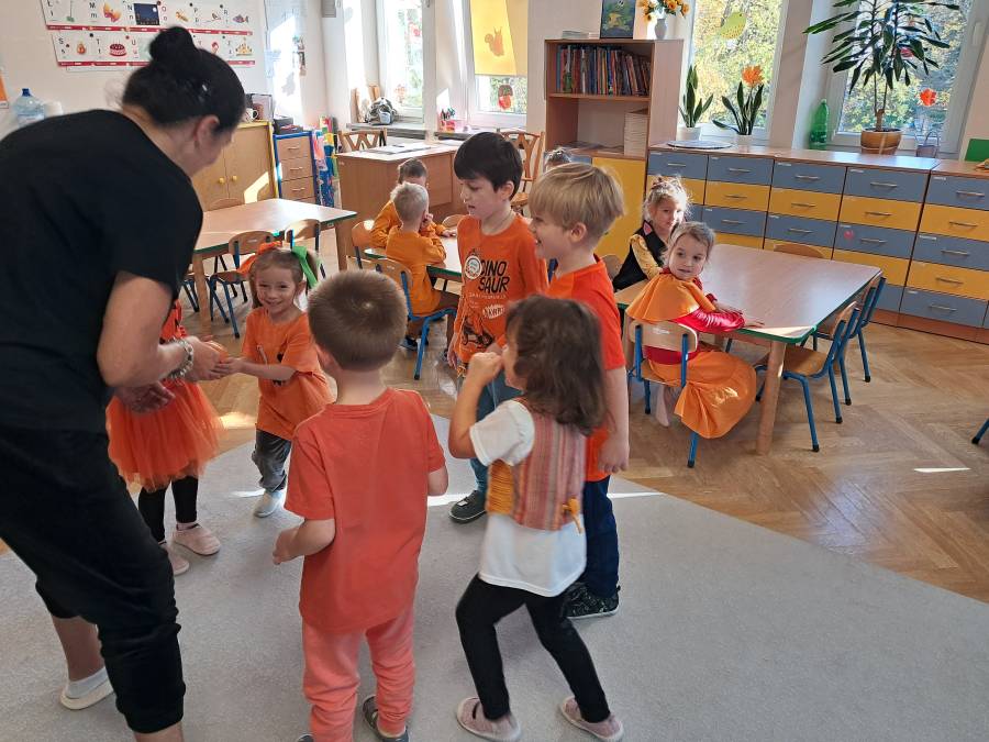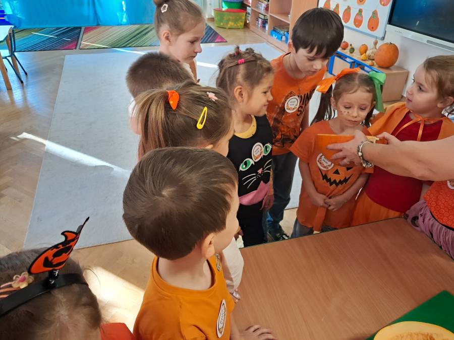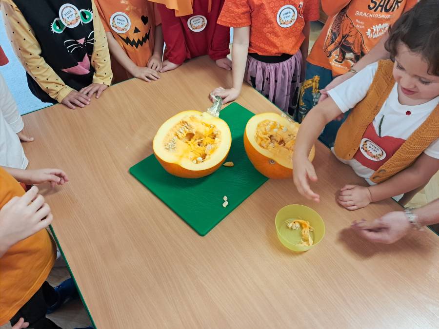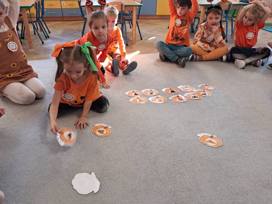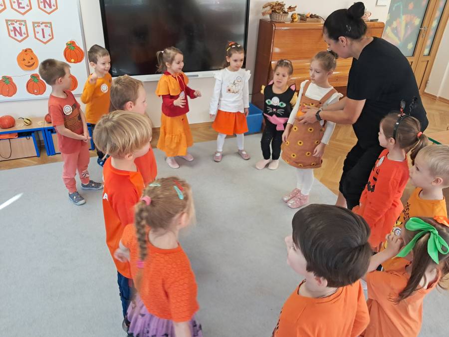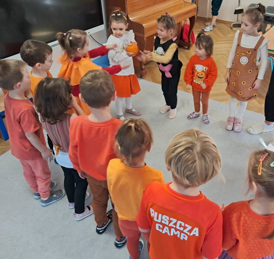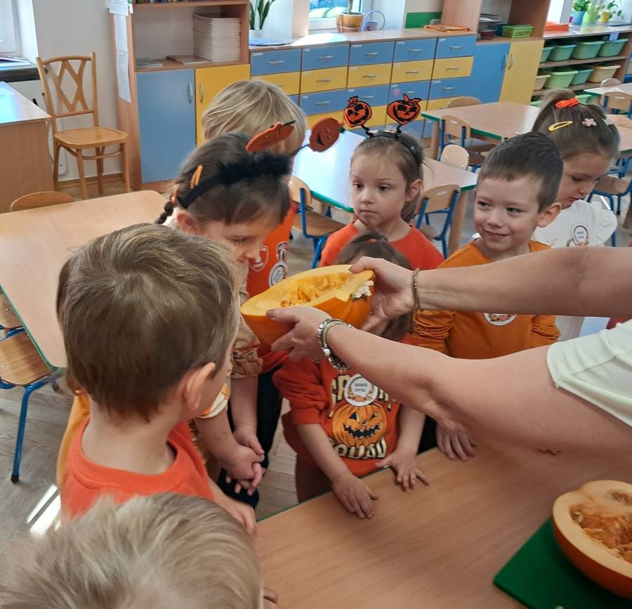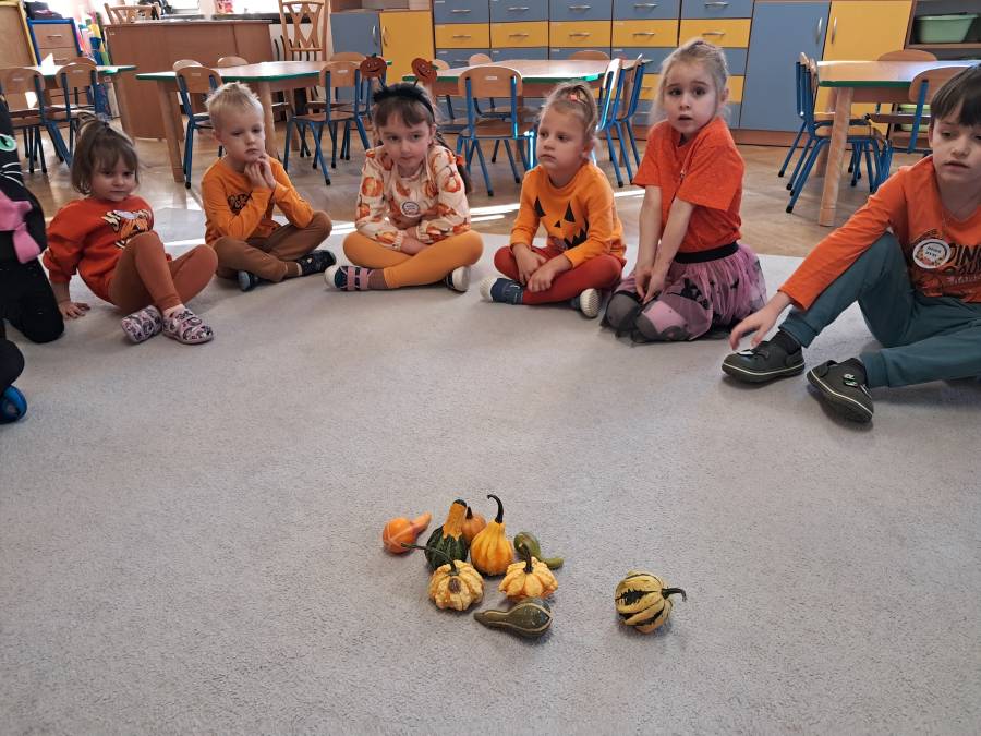 Dynia to bardzo zdrowe, wdzięczne i fajne do zabawy warzywo przekonały się o tym Żabki w piątek 31października 2025 w czasie obchodów Dnia Dyni. W tym dniu dzieci przyszły ubrane na kolor pomarańczowy, dowiedziały się jakie potrawy można przygotować z wykorzystaniem dyni. Przedszkolaki uczestniczyły w zabawie dyniowej opartej na muzyce i ruchu Wędrująca dynia, dopasowywały cienie dyń, miały możliwość zobaczyć jak wygląda dynia w środku i wyciągać jej zawartość. Ten dzień był pełen wrażeń i radości.