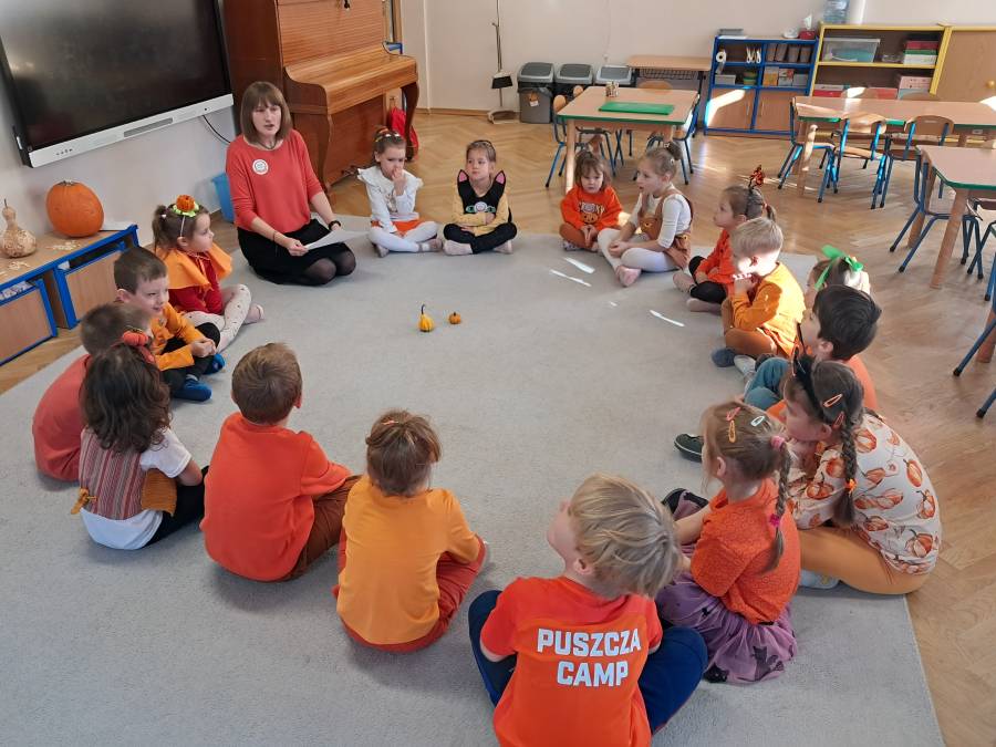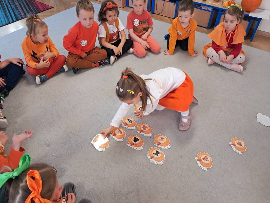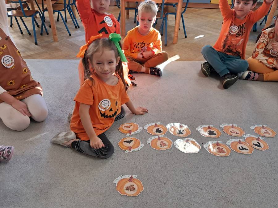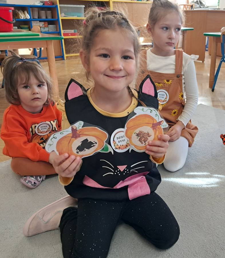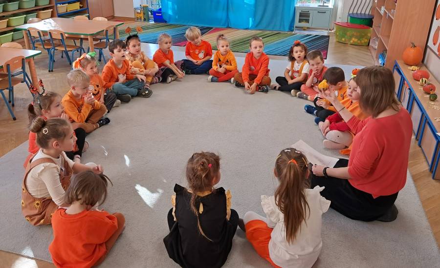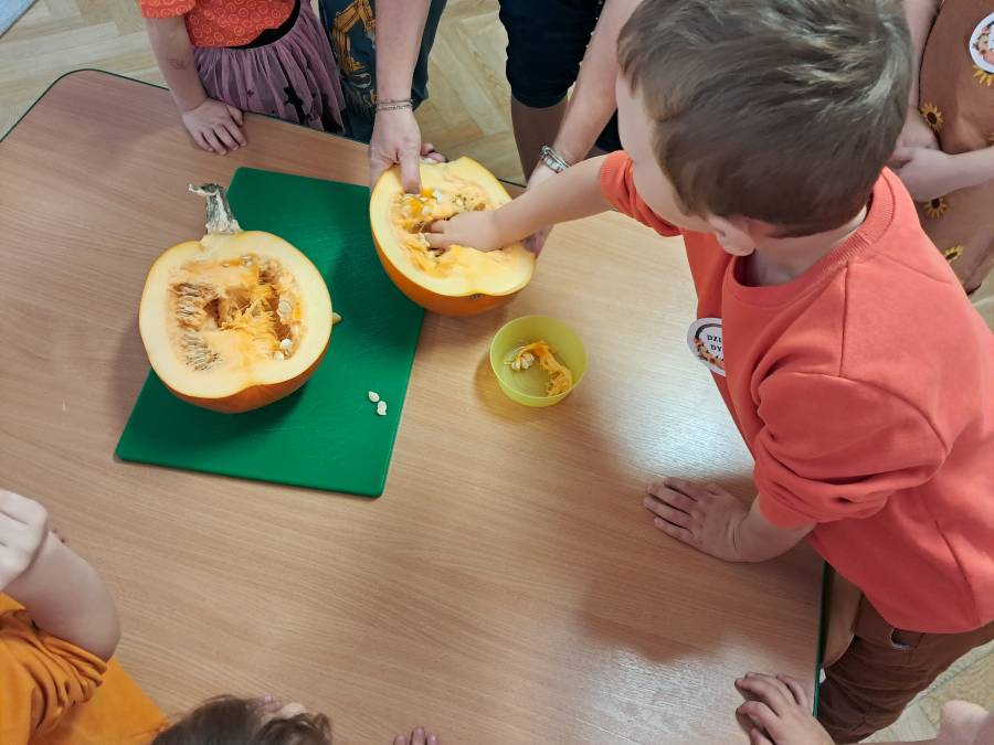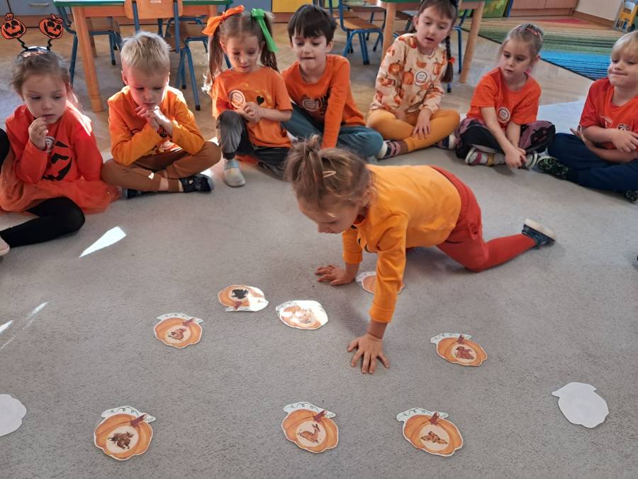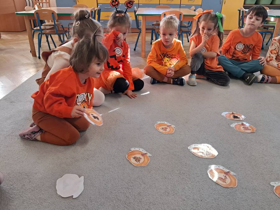 Dynia to bardzo zdrowe, wdzięczne i fajne do zabawy warzywo przekonały się o tym Żabki w piątek 31października 2025 w czasie obchodów Dnia Dyni. W tym dniu dzieci przyszły ubrane na kolor pomarańczowy, dowiedziały się jakie potrawy można przygotować z wykorzystaniem dyni. Przedszkolaki uczestniczyły w zabawie dyniowej opartej na muzyce i ruchu Wędrująca dynia, dopasowywały cienie dyń, miały możliwość zobaczyć jak wygląda dynia w środku i wyciągać jej zawartość. Ten dzień był pełen wrażeń i radości.