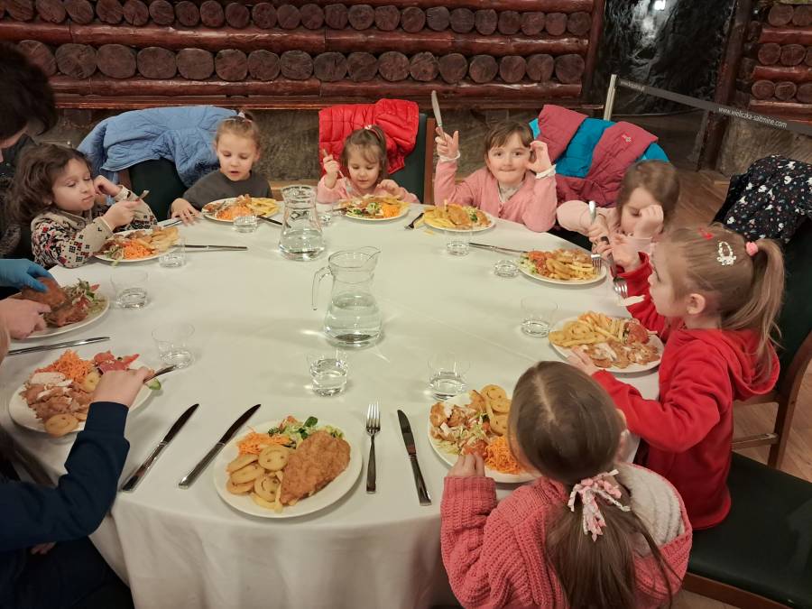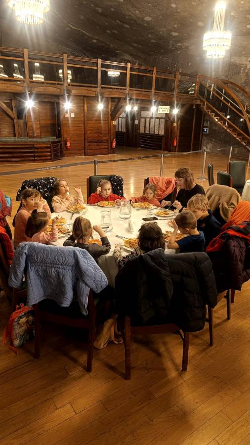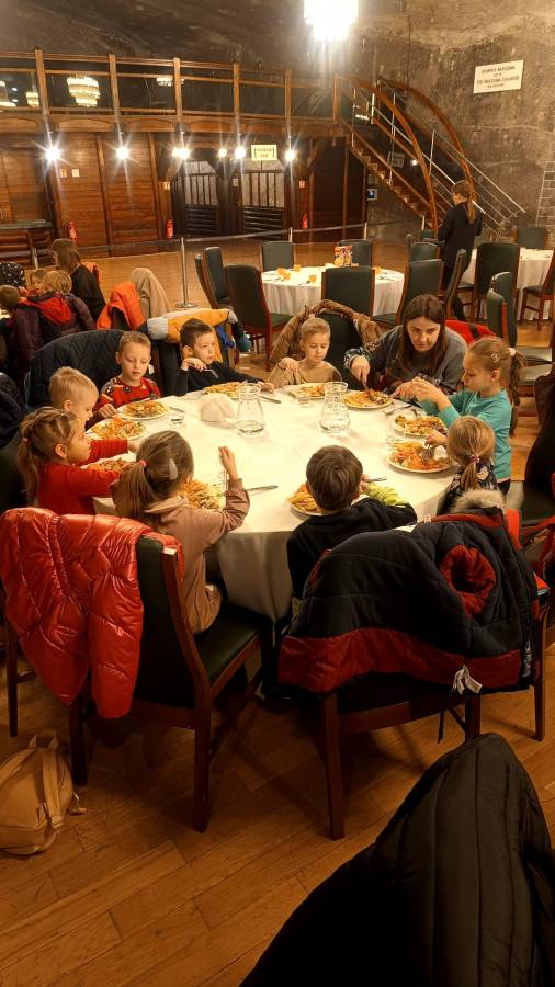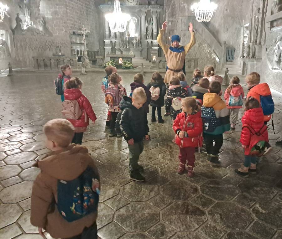 Grupa Żabek 10 grudnia, wybrała się na wycieczkę do kopalni soli w Wieliczce. Pod czujnym okiem pani przewodnik dzieci przemierzały podziemne korytarze, słuchając opowieści o bajkowych skrzatach, podziwiając podziemne jeziora solankowe, majestatyczne komory i kaplice wykute w soli. Na zakończenie wyprawy była niespodzianka- radosne spotkanie ze Skarbnikiem, który podarował dzieciom pamiątkowe dyplomy Przyjaciela Skarbnika. Wycieczka do kopalni to nie tylko była świetna zabawa, ale i niezapomniana przygoda, która rozbudziła dziecięcą wyobraźnię i ciekawość świata. Serdeczne podziękowania składamy pani Klaudii za zorganizowanie wycieczki.