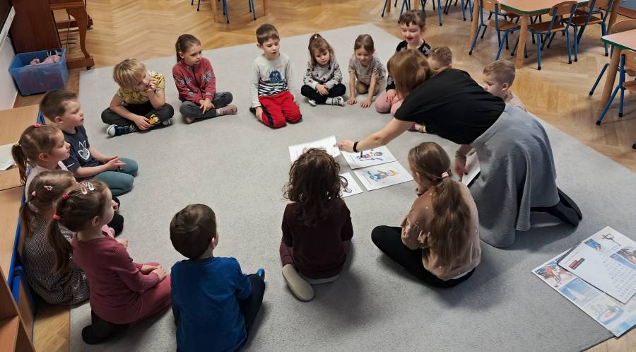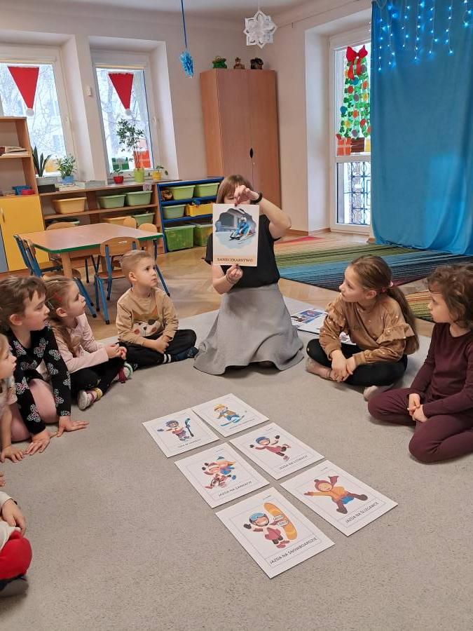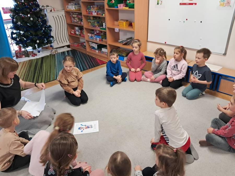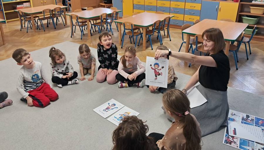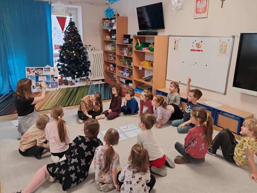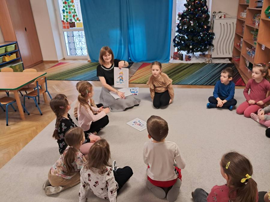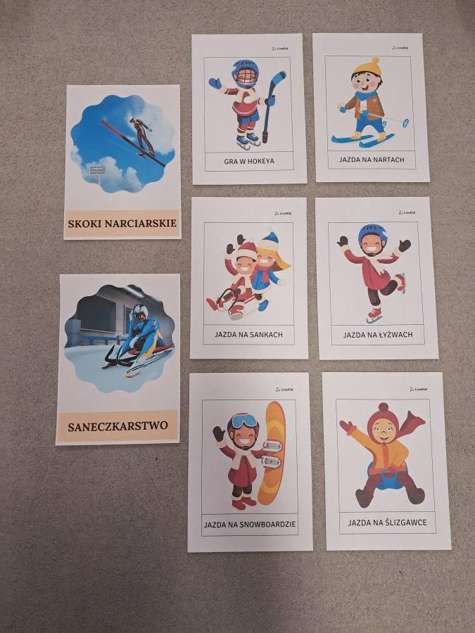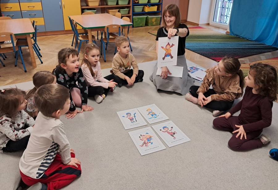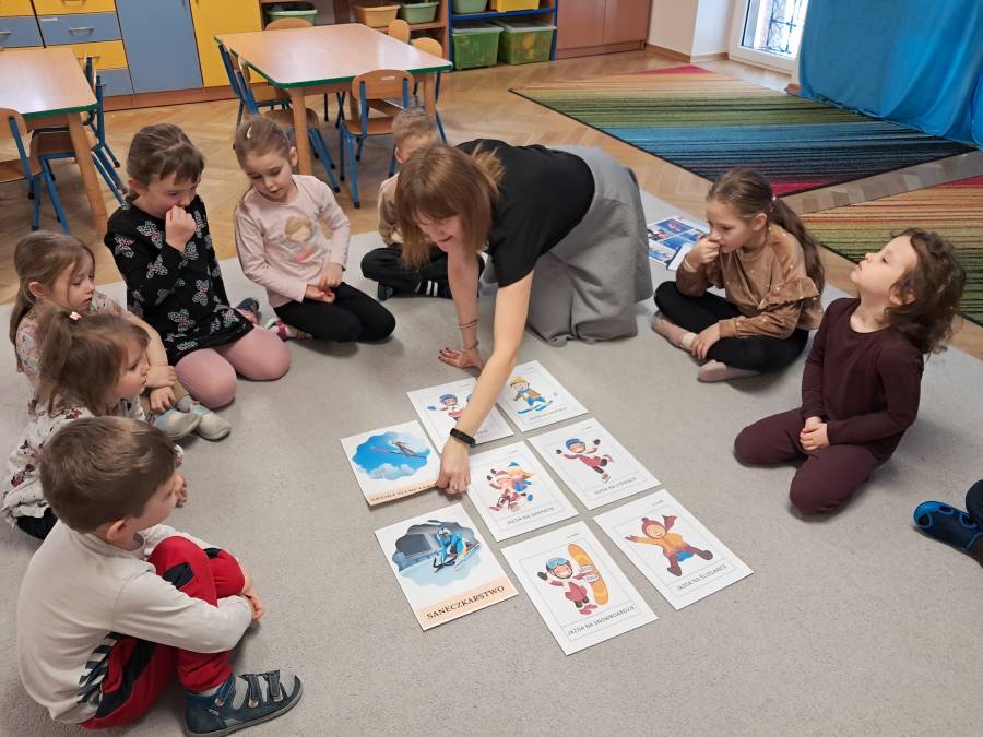 Żabki, na zajęciach dydaktycznych pt. Sporty zimowe miały możliwość wykazaniem się wiedzy na temat sportów zimowych, odgadywały zagadki o sportach i sprzętach zimowych oraz opowiadały o własnych doświadczeniach związanych z tematem zajęć. Na podsumowanie zajęć dzieci wykonały prace plastyczną Sporty zimowe.