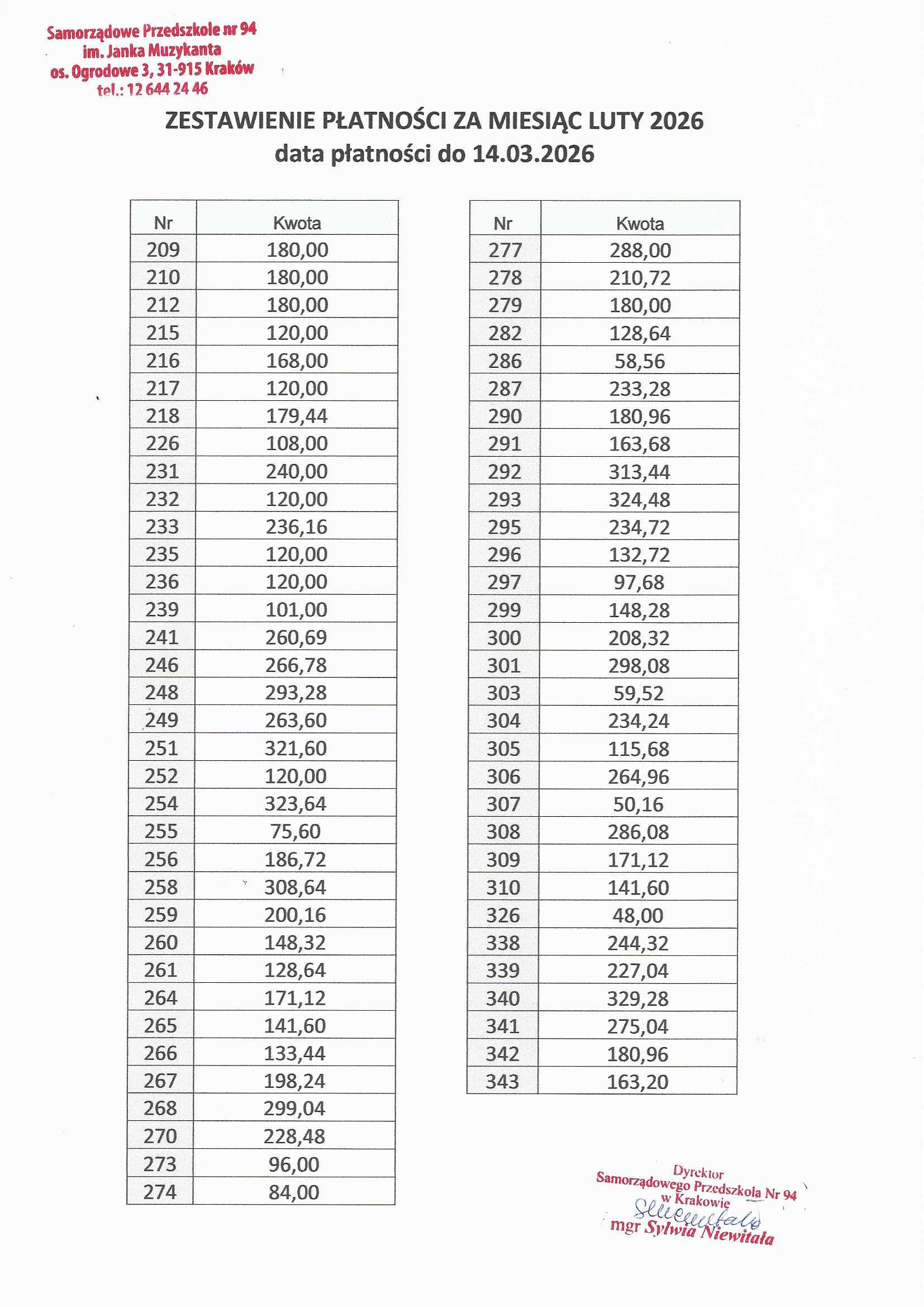 Po otrzymaniu niniejszej informacji rodzice/opiekunowie prawni dziecka są zobowiązani dokonać do dnia 14 tego miesiąca zapłaty we wskazanej wysokości na rachunek bankowy. Kwota należna do zapłaty powinna być zgodna z informacją otrzymaną od dyrektora.