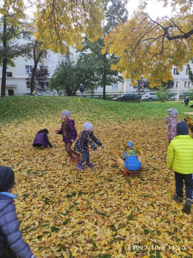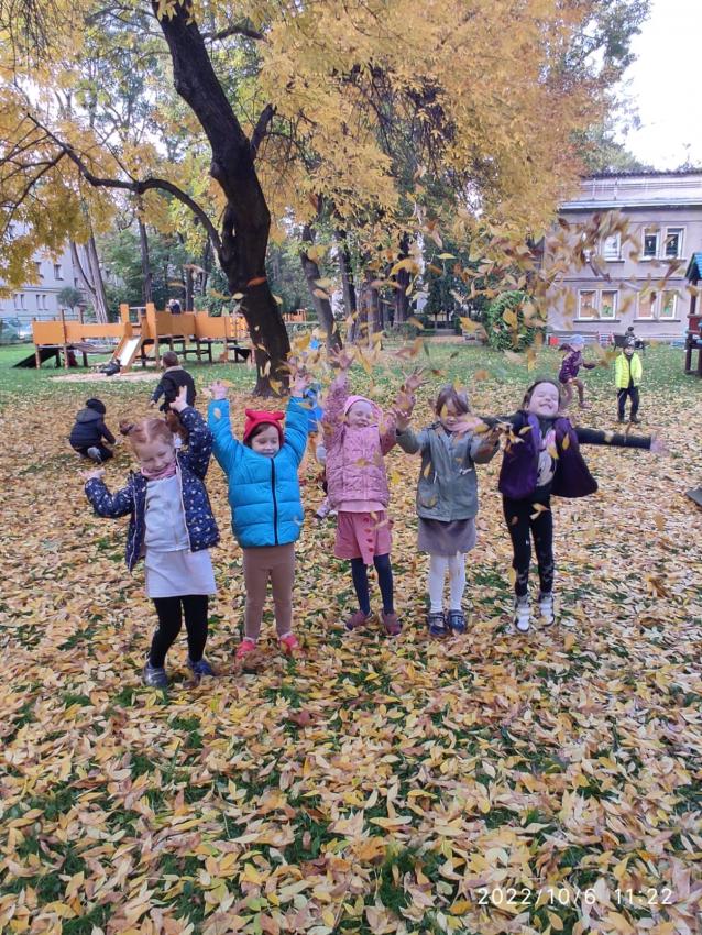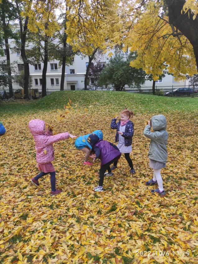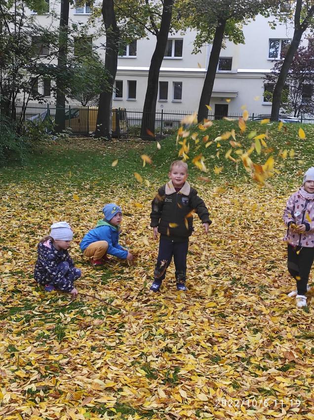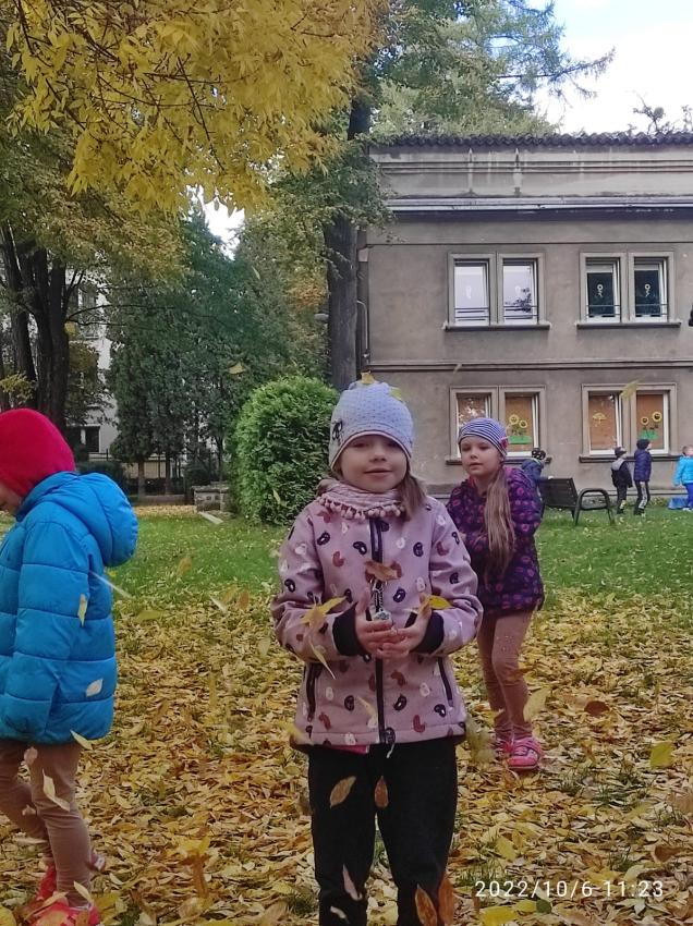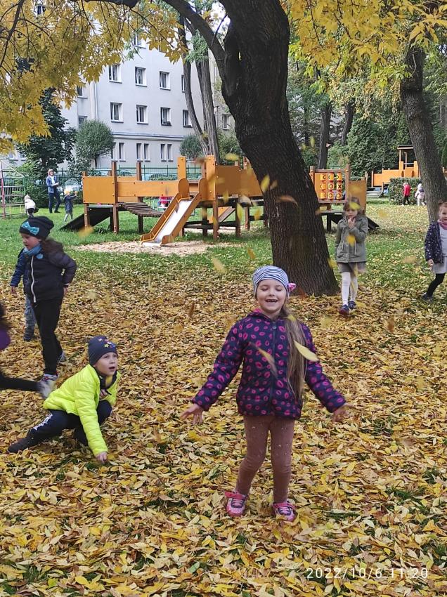 Biedroneczki w ogrodzie na zabawach z liśćmi.