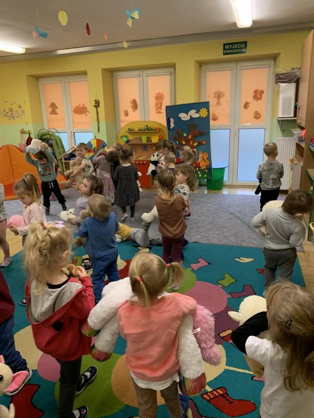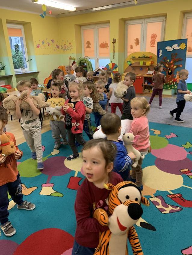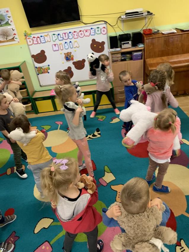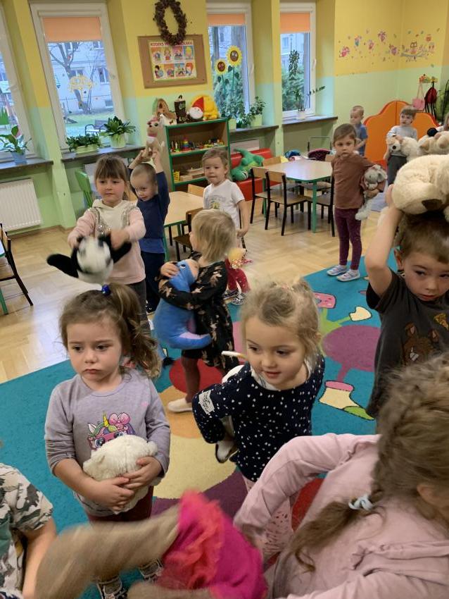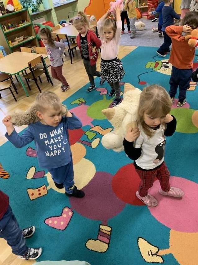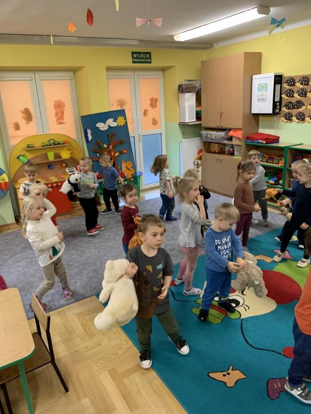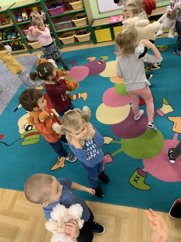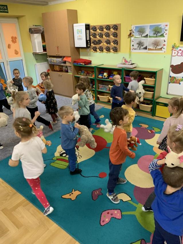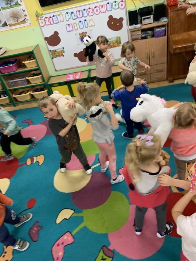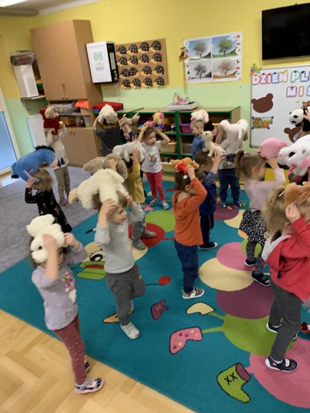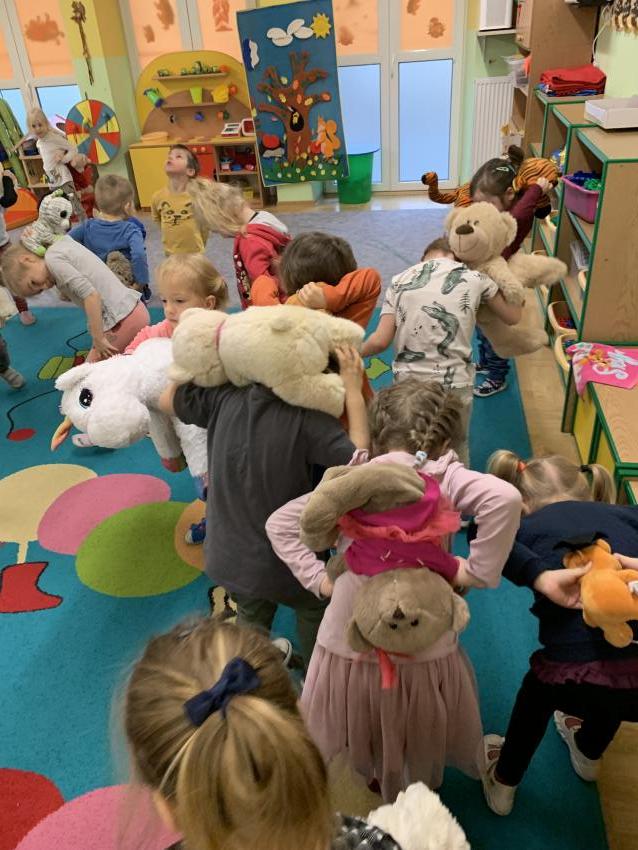 Zabawy, konkursy i wspólna zabawa grupy I i II z okazji Dnia Pluszowego Misia