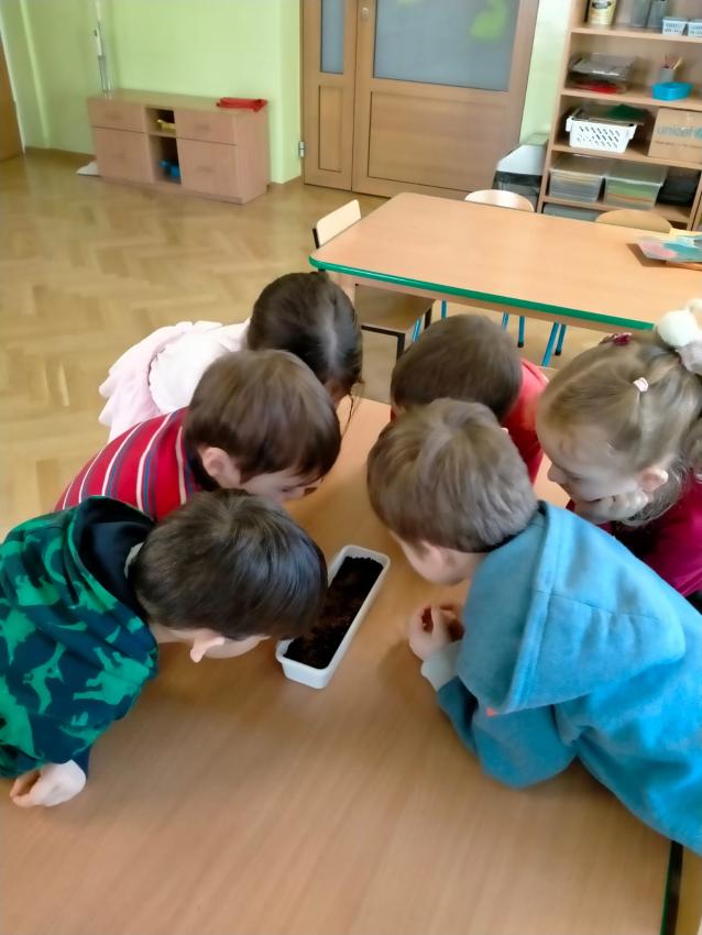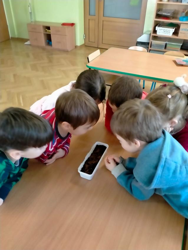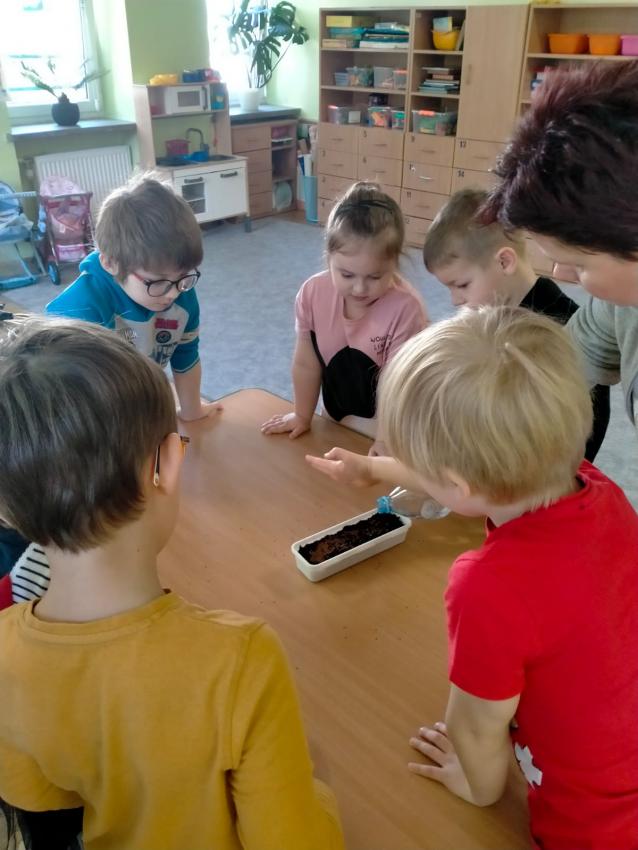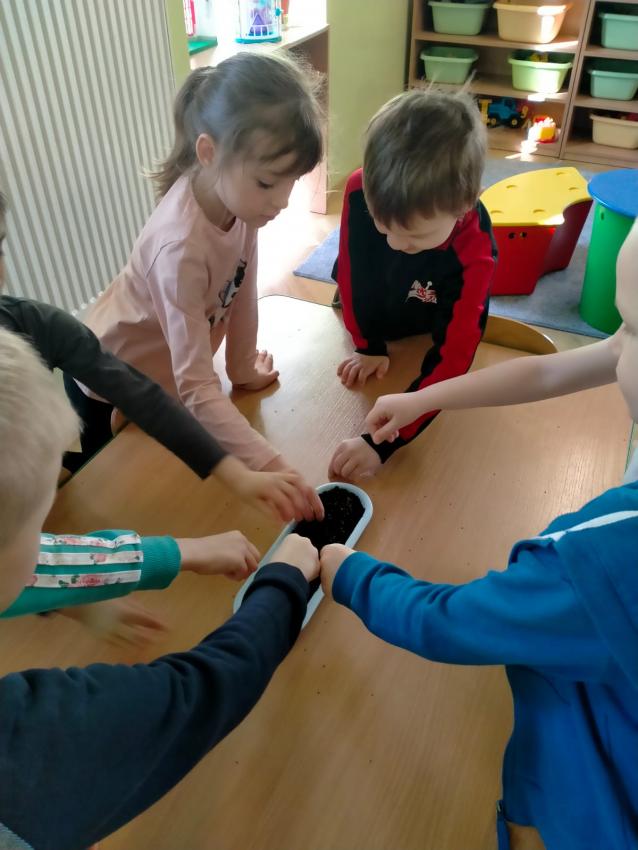 Zajączki to mali ogrodnicy, sieją rzeżuchę do kącika przyrody.