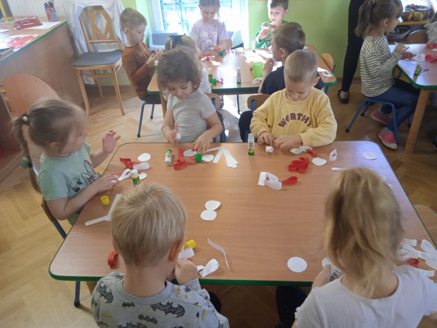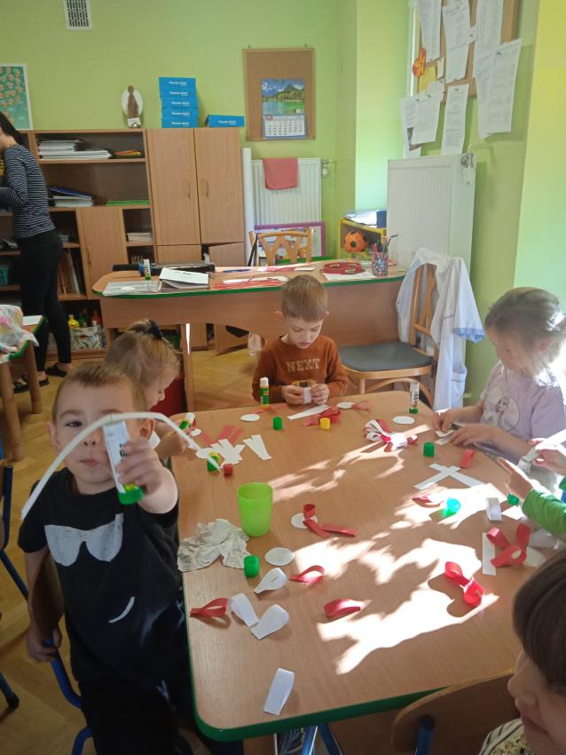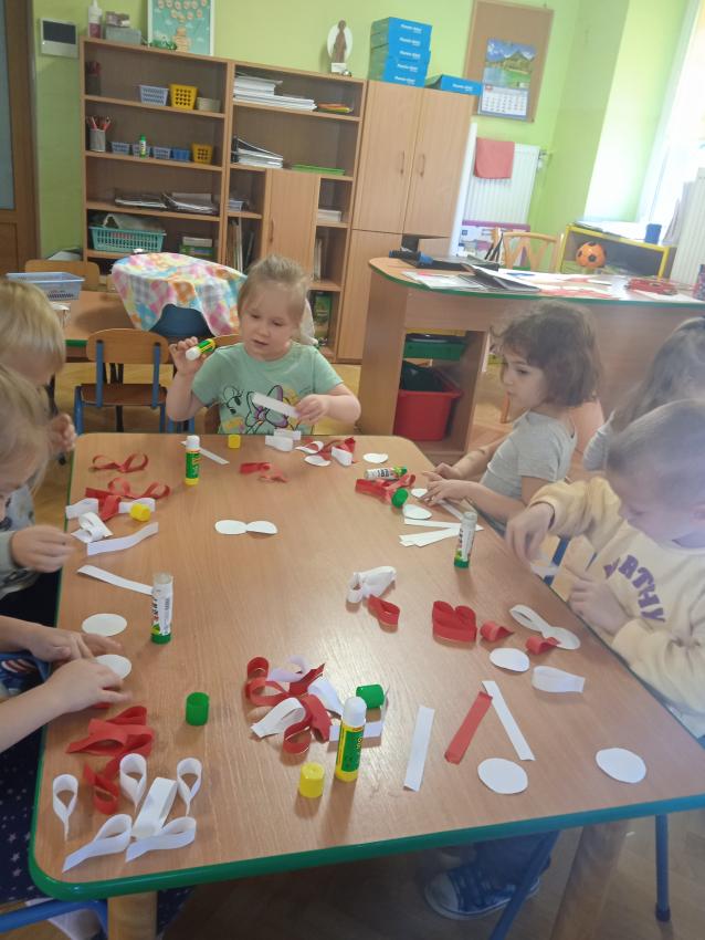 Wiewiórki wykonują kokardy narodowe, kotyliony z papieru na zajęciach pt. "Symbole narodowe".