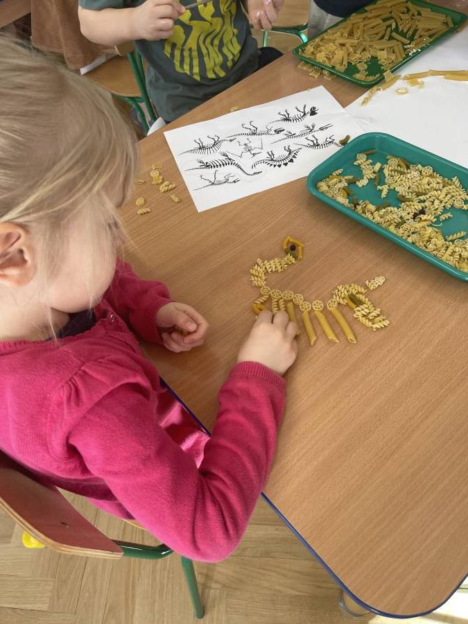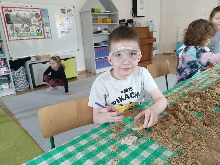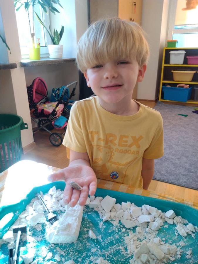 Dziś w przedszkolu dzieci zmieniły się w prawdziwych paleontologów. Czekała na nie misja odnalezienie ukrytych szkieletów dinozaurów. To nie tylko zabawa, ale też nauka przez doświadczenie. Dzieci rozwijały motorykę małą, spostrzegawczość i poszerzały wiedzę o dinozaurach.