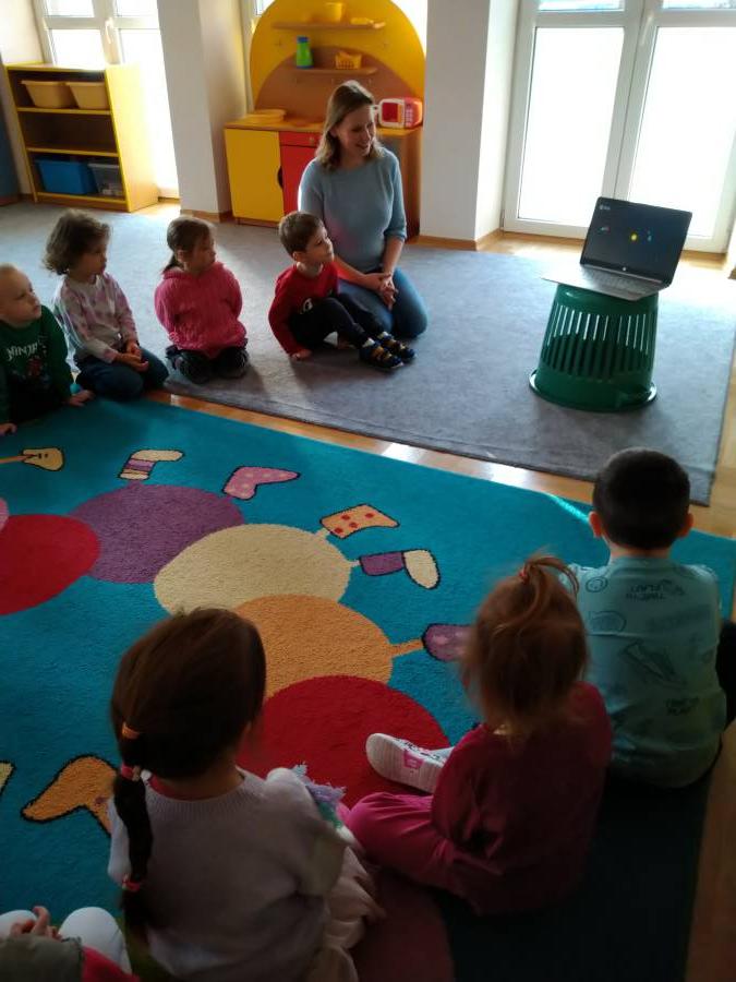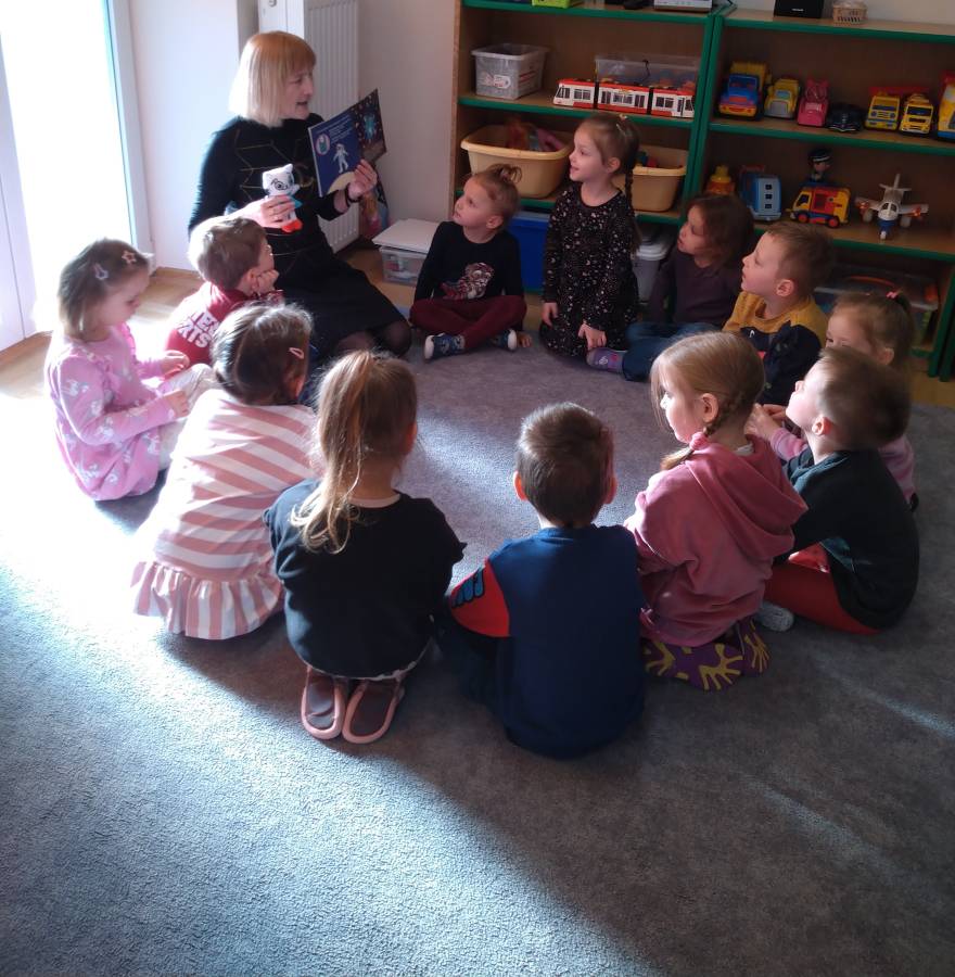 Żabki z wielką ciekawością wysłuchały bajki pt. Kicia Kocia w kosmosie, która jest realizowana w ramach innowacji pedagogicznej. Książki rozwijają u dzieci wyobraźnię i kreatywność, przenosząc ich w różne światy i pozwalając im na przeżywanie różnych przygód.