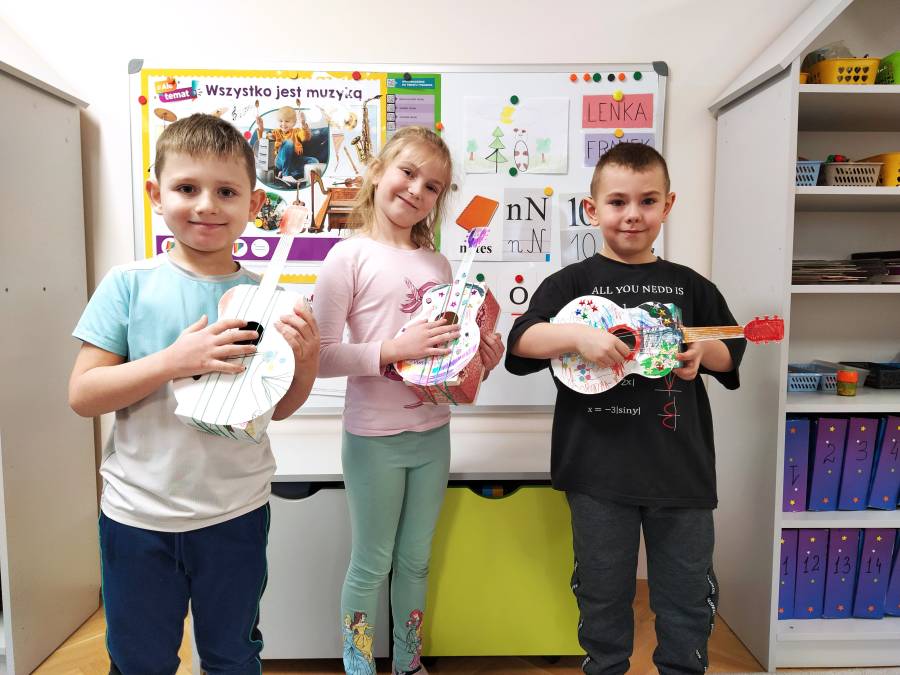Żabki świetnie się bawiły podczas zajęć do tematu Zabawy muzyczne z Kicią Kocią. Na początku wysłuchały bajki jak Kicia Kocia zakładała zespół, następnie w zabawie muzyczno- ruchowej dzieci improwizowały do puszczonego utworu muzycznego, trzymając w ręce wstążkę bibuły. Na zakończenie zajęć Żabki wykonały grzechotkę wsypując do pojemniczka ryż i ozdabiając ją według własnego pomysłu używając do tego plasteliny, cekinów, pomponików.