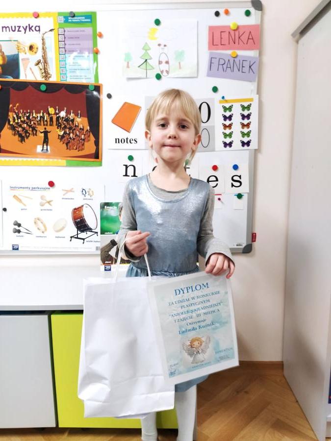 Miło nam poinformować, że Ludmiła Kuźnik wzięła udziału w konkursie plastycznym pt. ,, Aniołek najładniejszy' organizowanym przez Przedszkole przy Szkole podstawowej nr 1 w Krakowie, w którym zdobyła III miejsce. Serdecznie GRATULUJEMY!!!