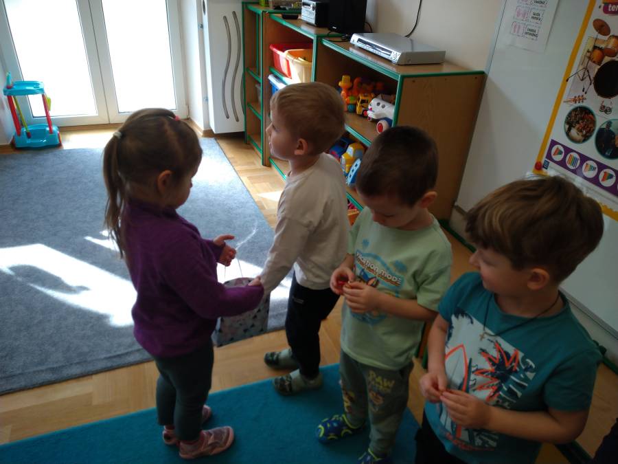 W grupie Żabek chłopcy nie zapomnieli o szczególnym dniu jakim jest Dzień Kobiet. W związku z tym złożyli dziewczynką życzenia i wręczyli słodki upominek. W zamian za ten sympatyczny gest zostali poczęstowani cukierkami.