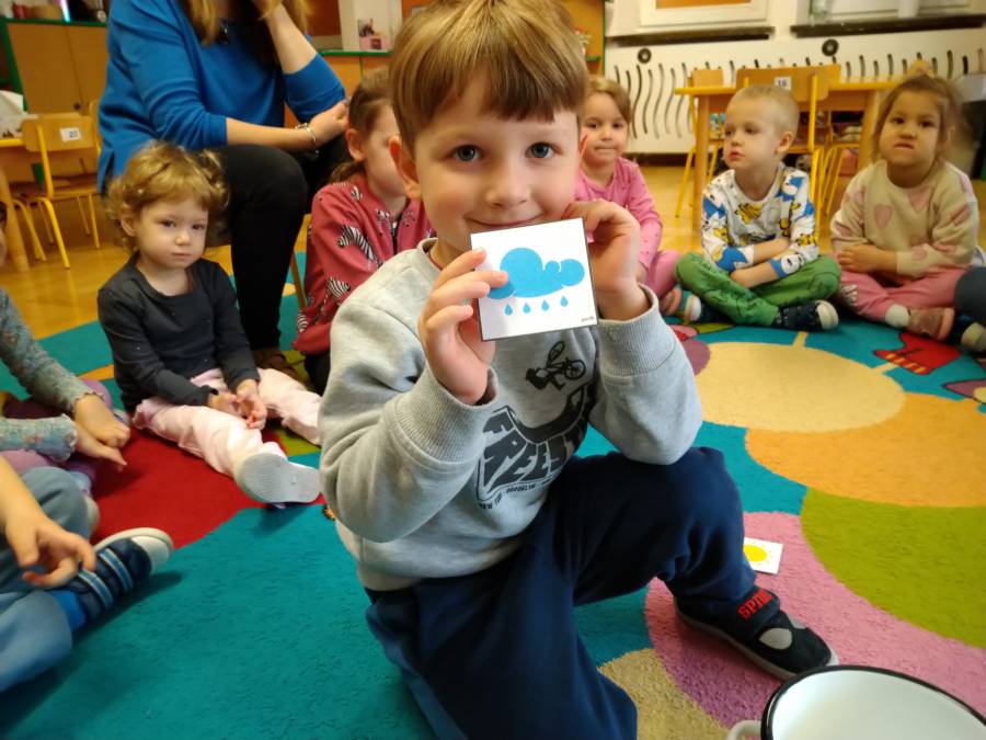 Tematem zajęć w grupie Żabek była marcowa pogoda. Dzieci poznały przysłowie ?W marcu jak w garncu? i dowiedziały się, co ono oznacza. Przedszkolaki przypomniały sobie nazwy występujących w okresie przedwiośnia zjawisk atmosferycznych tj. deszcz, wiatr, słońce, śnieg, chmury, utrwalały oznaczające je symbole graficzne, które wyciągały z garnka.