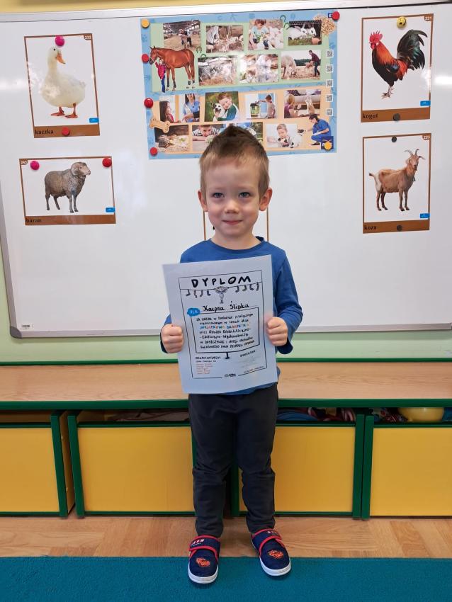 Kacperek z gr I zdobył dyplom za udział w konkursie plastycznym pt. "Wyjątkowa skarpetka"