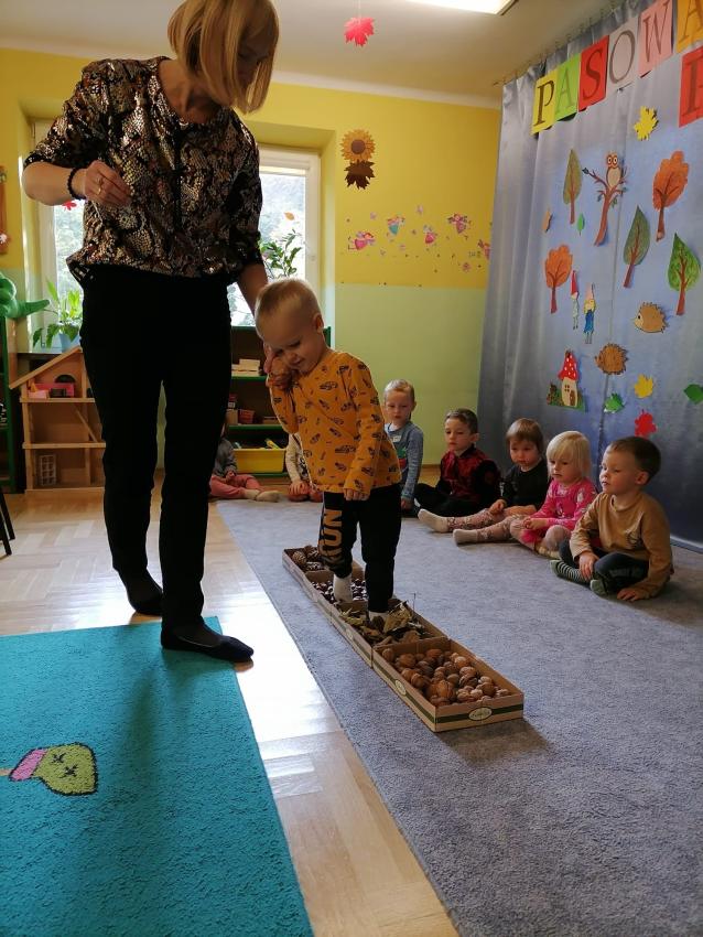 Dzieci z grupy Żabek korzystały w pełni z darów jesieni. Przedszkolaki rozwijały swoje wrażenia dotykowe i stymulowały zmysły przechodząc bez pantofli po ścieżce sensorycznej,