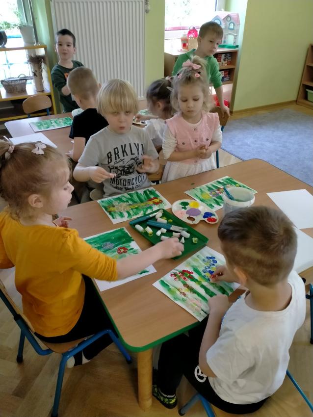 Majowa łąka - zabawa plastyczna w stemplowanie farbami plakatowymi